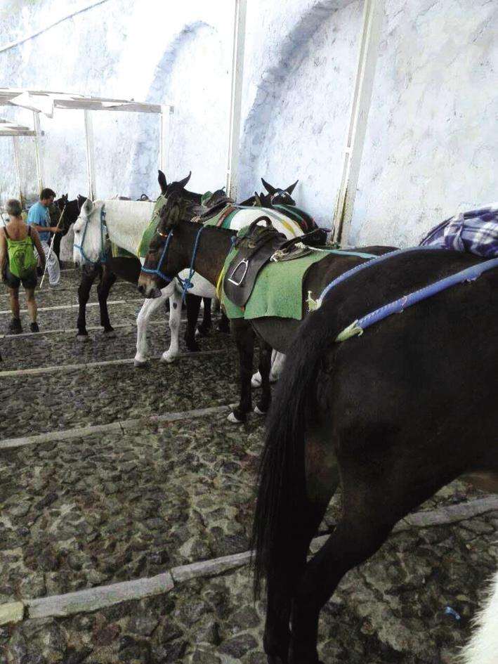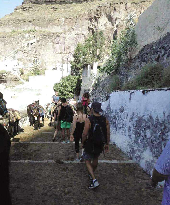 于是,在窄窄的下山小道上,挤满了骑驴、骑马、骑骡子的游客,即使在每个驴子队伍的前后都有一个控制牲口的希腊人,不断喊着只有他们和牲口们可以听懂的语言,试图控制牲口队伍。但是,牲口毕竟是牲口,乱跑乱跳,游客的惊呼声也此起彼落。