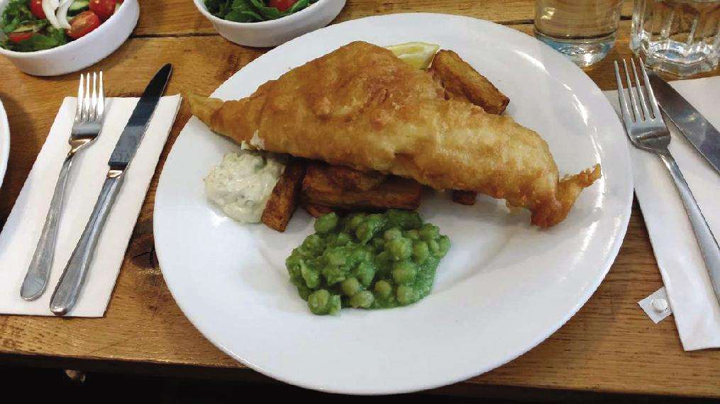 炸鱼和炸薯条,加上一点煮豌豆,这是典型的英式午餐,品尝之后,余香萦绕口中,回味无穷。