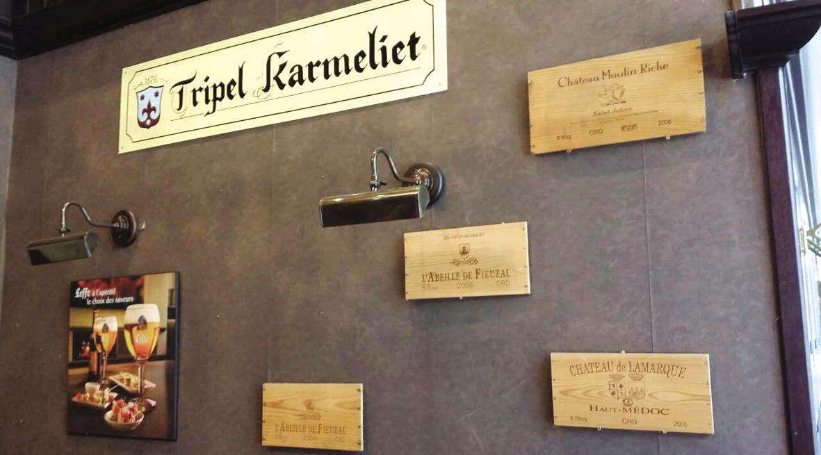 餐馆毕竟是个商业场所,墙上的装饰就把餐馆的商业意图挑明了。墙上的牌子是餐馆代理销售的各种啤酒和葡萄酒的标志。
