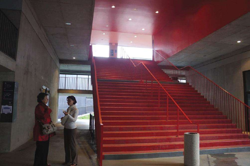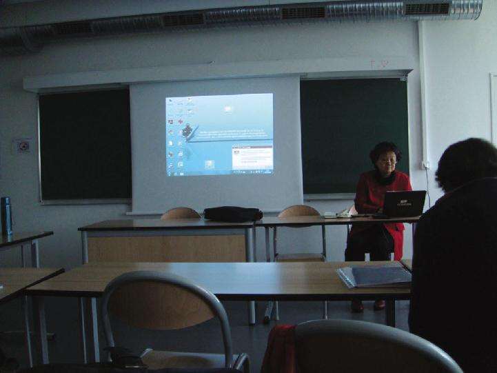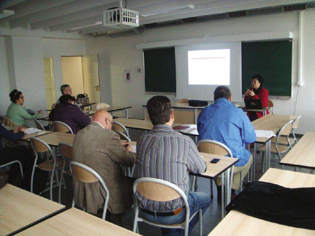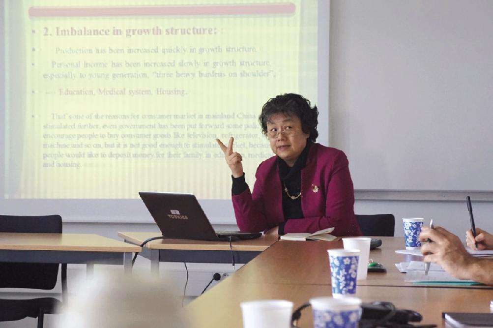 下课后,我和法国老师在走廊交流,她曾到暨南大学做访问