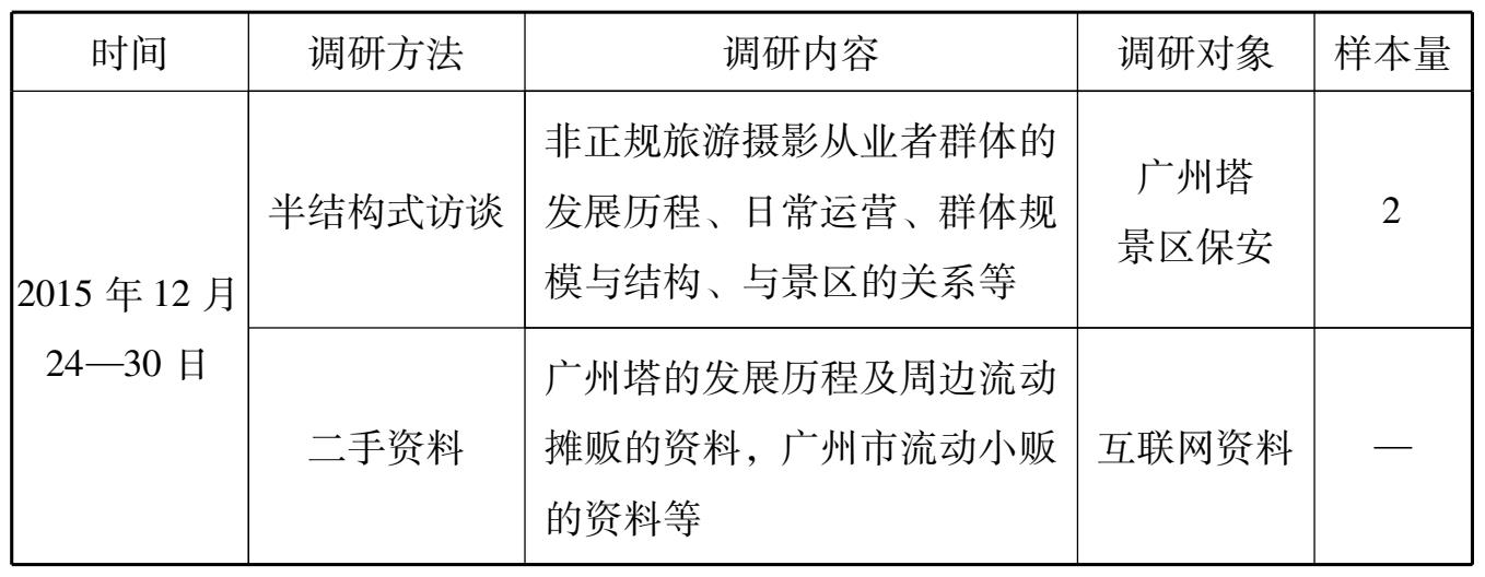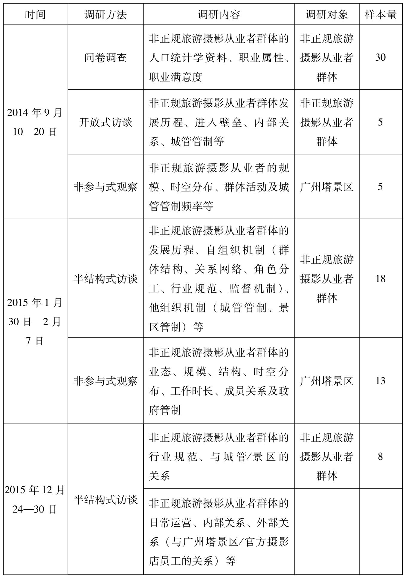 本书的调研工作共分为四个阶段,分别是预调研阶段(2014年9月10—20日)、正式调研阶段(2015年1月30日—2月7日)、补充调研阶段(2015年12月24—30日),平均每次调研持续 7~10天,以及跟踪调研阶段(2016年1月1日—2021年5月15日)。跟踪调研阶段是研究团队利用团队所在地与广州塔景区的地理邻近性,多次、持续开展的非参与观察和半结构访谈,目的是持续跟踪这一群体的发展变化。其中,前三个时间段为主要的调研阶段,见表1-2。