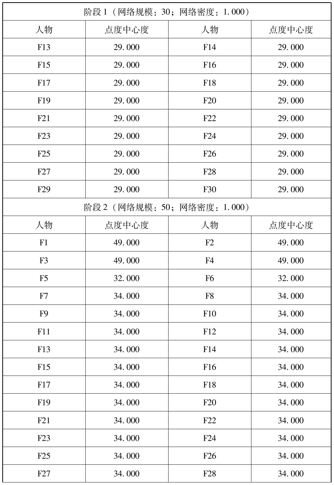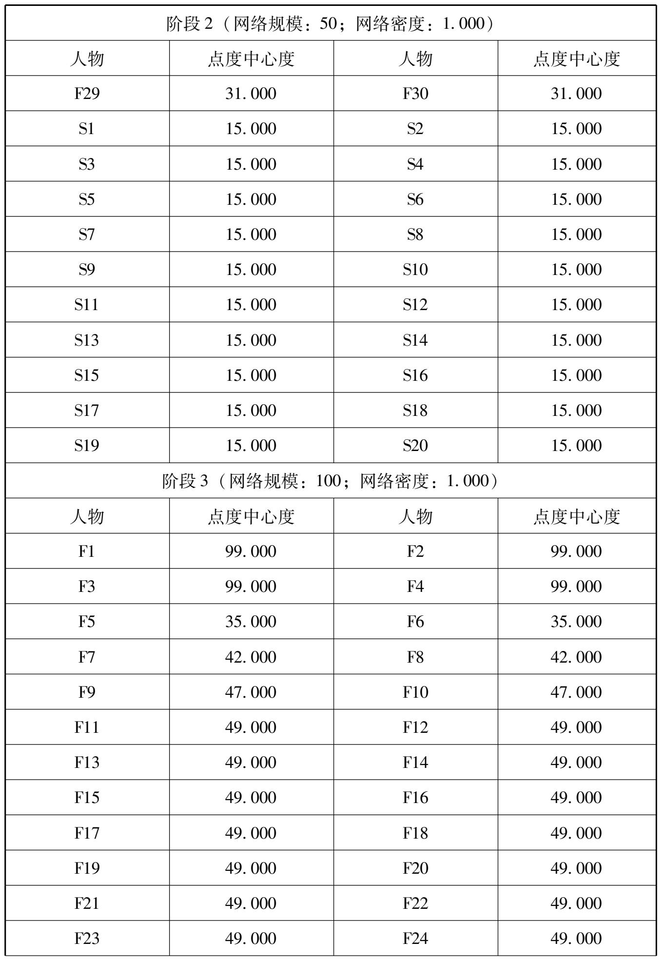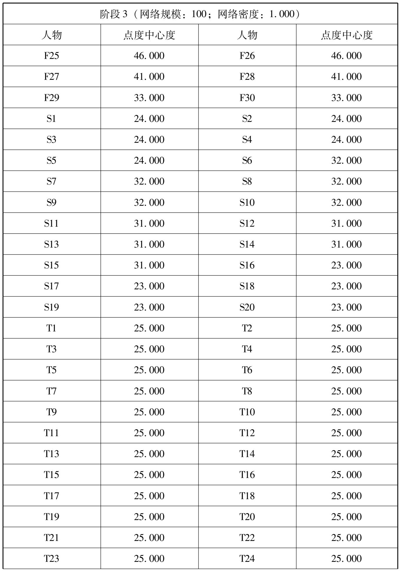 在模拟的过程中,本书把开拓期的 30名首批进入者分别命名为F1至F30,把发展期的 20名进入者分别命名为S1至S20,把自治期的 50名进入者分别命名为T1至T50。其中,F1与“胖子”(M09)对应,F2与“王哥”(M14)对应,两人与F3、F4共 4位首批进入者组成了非正规旅游摄影从业者的关键人物团体;而F5至F30、S1至S20、T1至T50等 96人只区分了不同的进入阶段,并没有与受访者M1至M31形成一一对应的关系。而在分析的过程中,本书基于表1-6的网络分析特点进行整体网分析,选择网络规模、网络密度、点度中心度三个关键性指标作为社会网络分析研究视角,见表1-7。