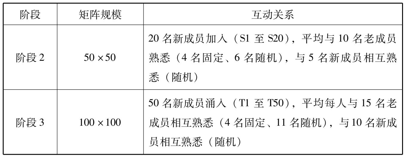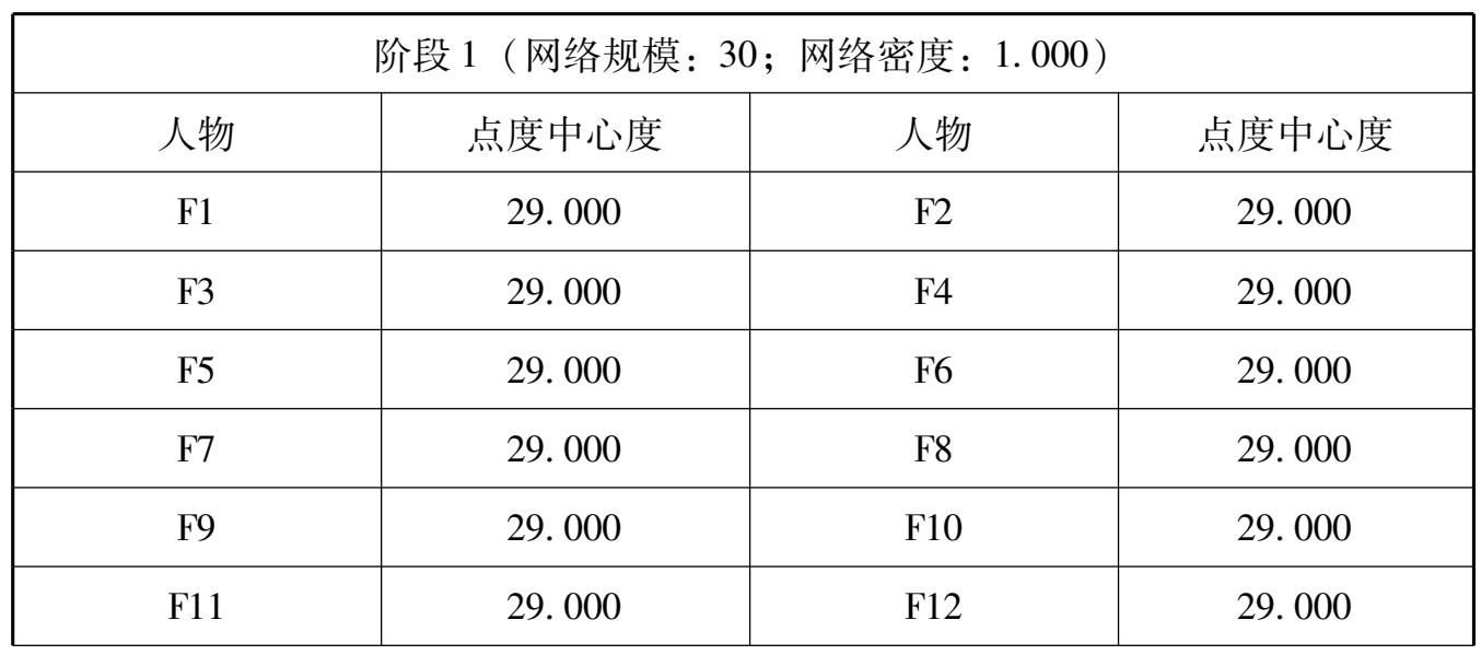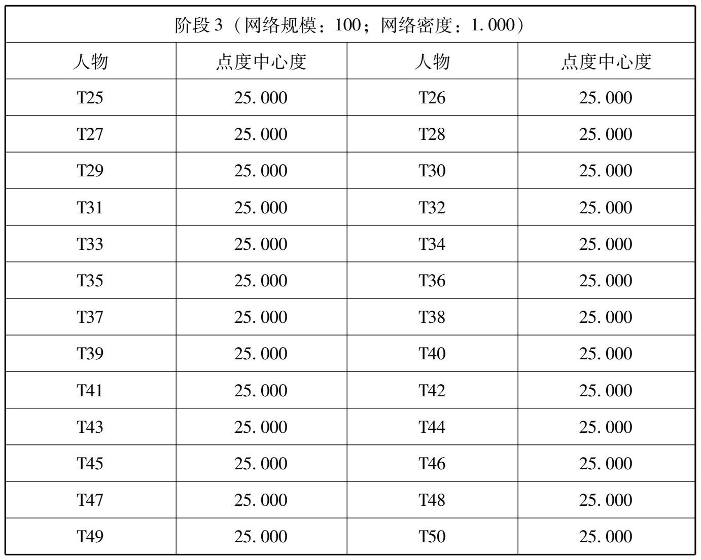 在模拟的过程中,本书把开拓期的 30名首批进入者分别命名为F1至F30,把发展期的 20名进入者分别命名为S1至S20,把自治期的 50名进入者分别命名为T1至T50。其中,F1与“胖子”(M09)对应,F2与“王哥”(M14)对应,两人与F3、F4共 4位首批进入者组成了非正规旅游摄影从业者的关键人物团体;而F5至F30、S1至S20、T1至T50等 96人只区分了不同的进入阶段,并没有与受访者M1至M31形成一一对应的关系。而在分析的过程中,本书基于表1-6的网络分析特点进行整体网分析,选择网络规模、网络密度、点度中心度三个关键性指标作为社会网络分析研究视角,见表1-7。