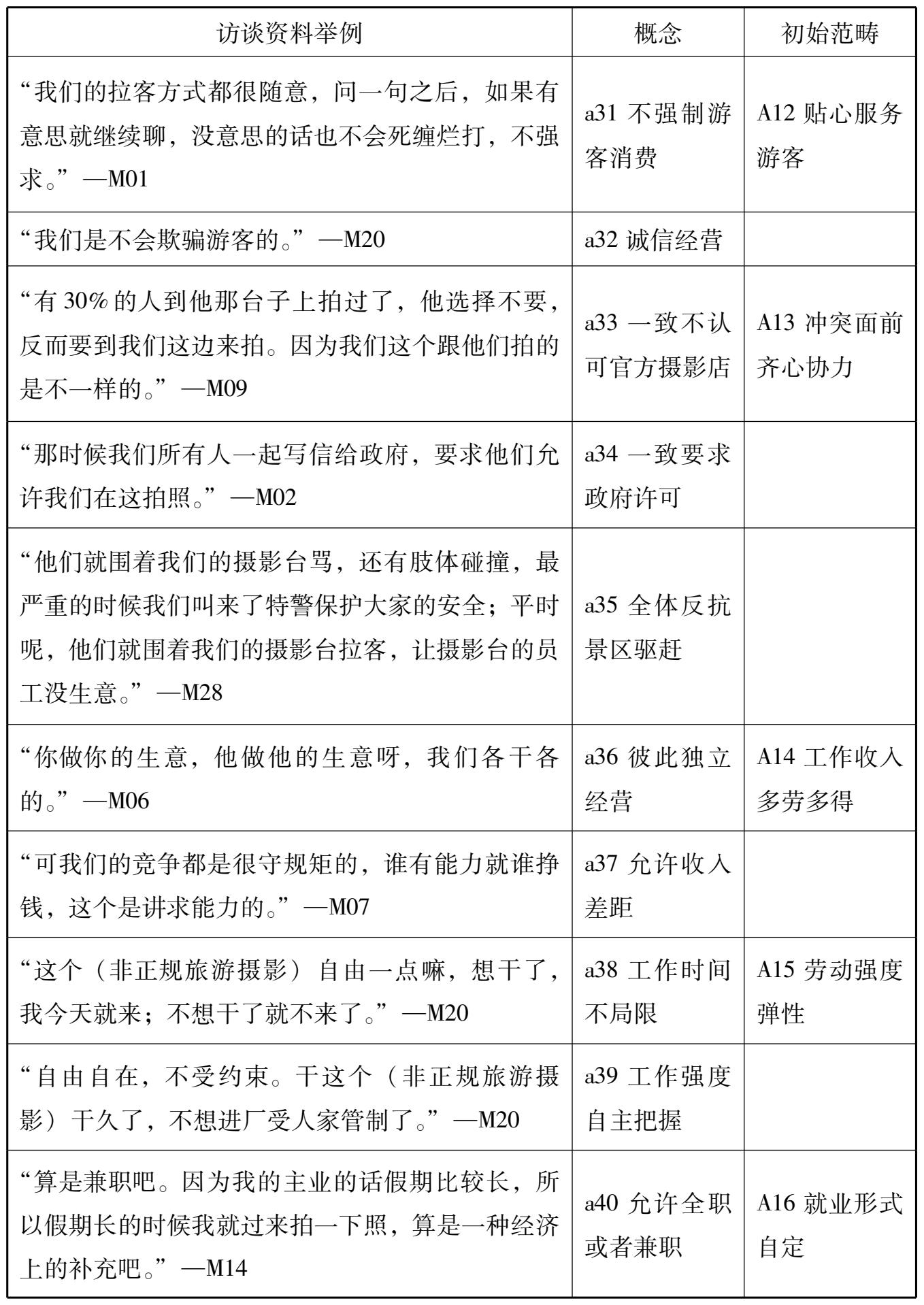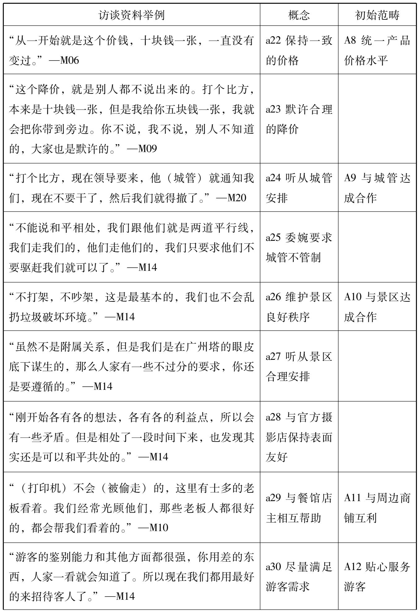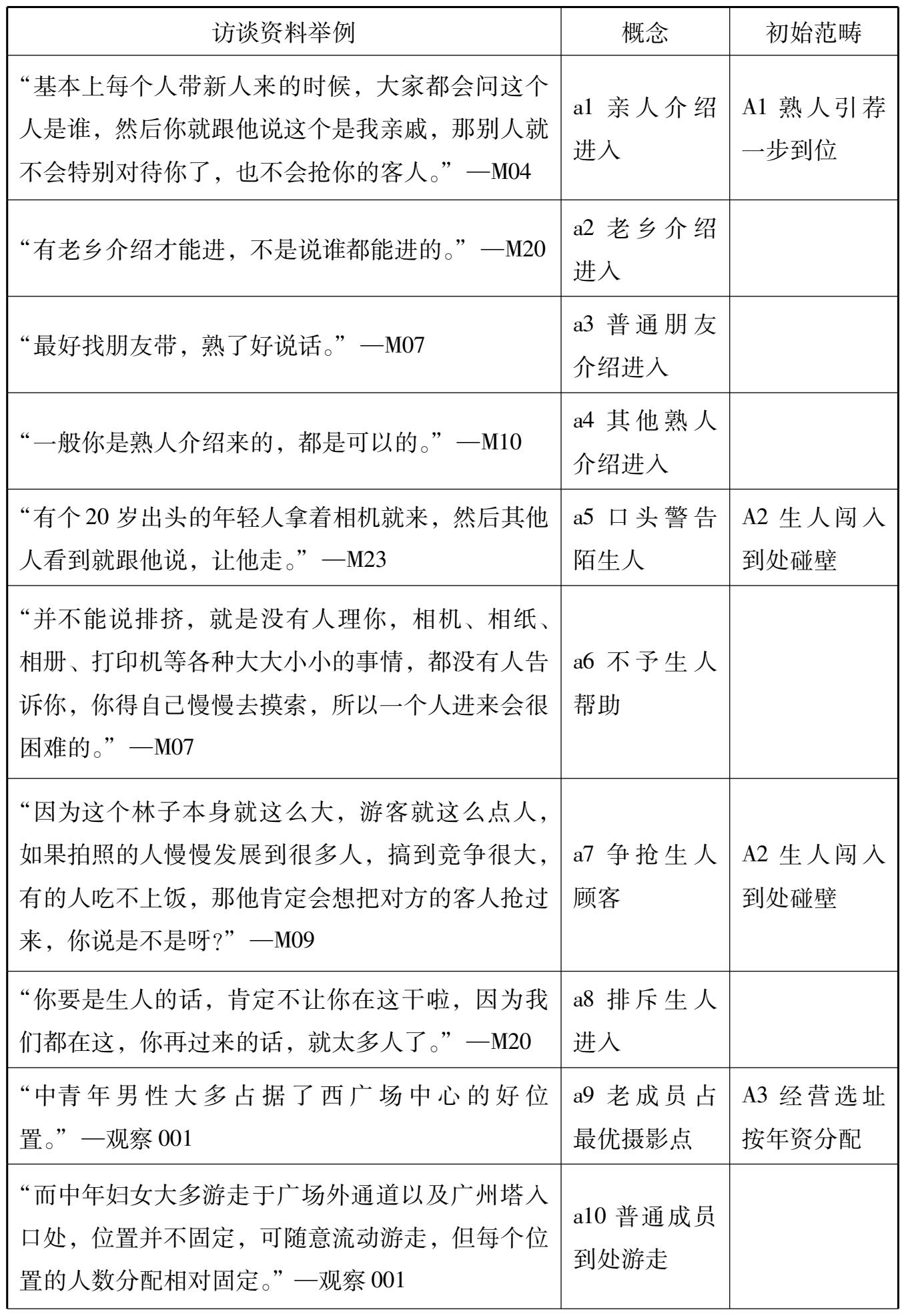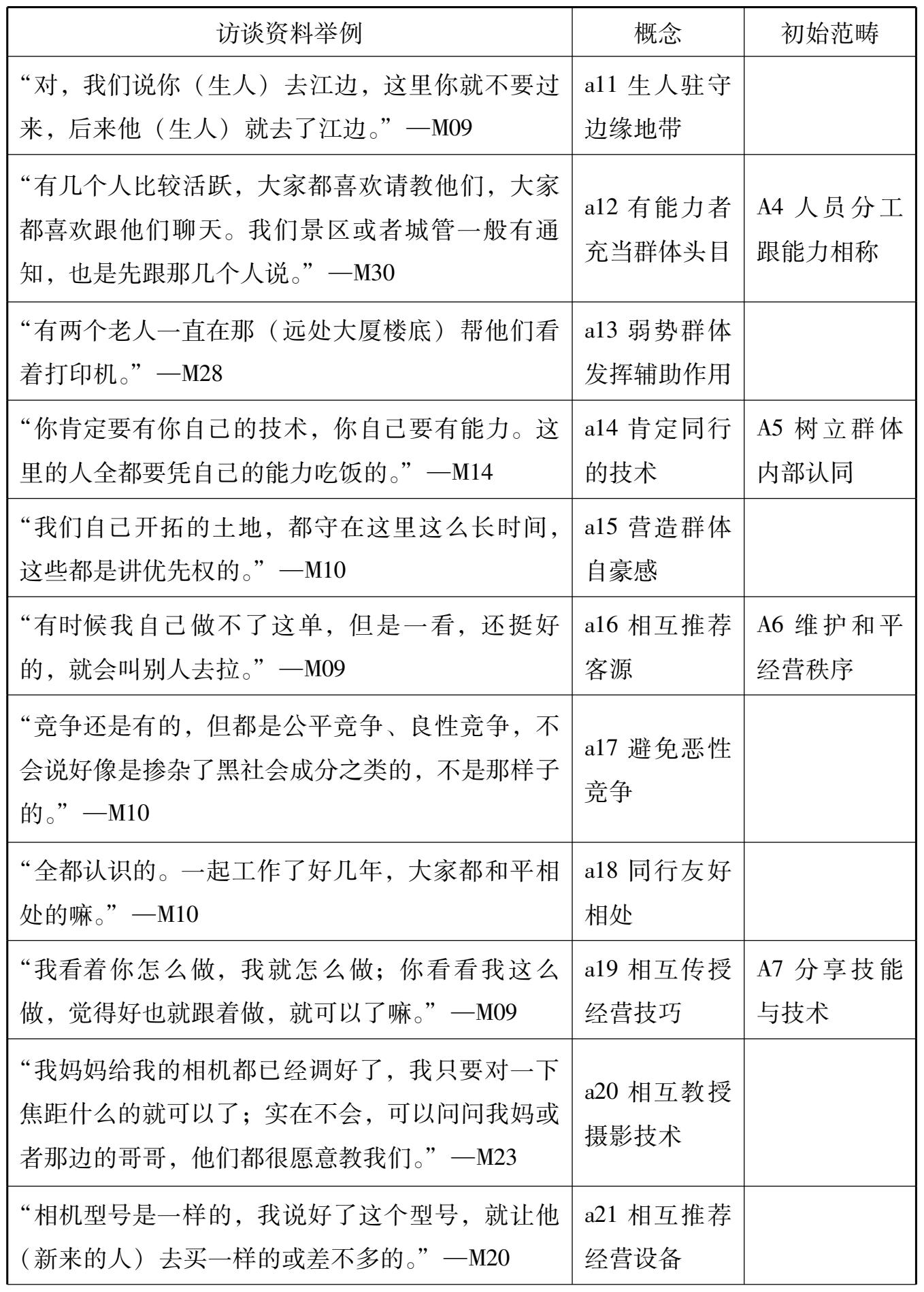 通过对所有获得资料的初步整理,本书最终获得 250多条原始资料语句及相对应的概念。由于初始概念数量较多且彼此存在一定的交叉,需要将初始概念进一步概括和提炼,并最终实现概念化和范畴化。因此,本书首先对这 250多条数据进行合并和初步概括,例如,“并不能说排挤,就是没有人理你,相机、相纸、相册、打印机等各种大大小小的事情,都没有人告诉你,你得自己慢慢去摸索,所以一个人进来会很困难的”和“客就那么多,整个广场也就这么大,你一个毫无关系的人来,实际上就是来跟我抢生意,就算我有多大的能力,有多自信,还是不想看到这种现象发生,所以我凭什么要帮你呢”合并为同一个意义单元,并赋予“不予生人帮助”的命名。通过对开放性编码内容反复多次的整理,最后得到 40个概念,16个初始范畴,具体如表1-4所示: