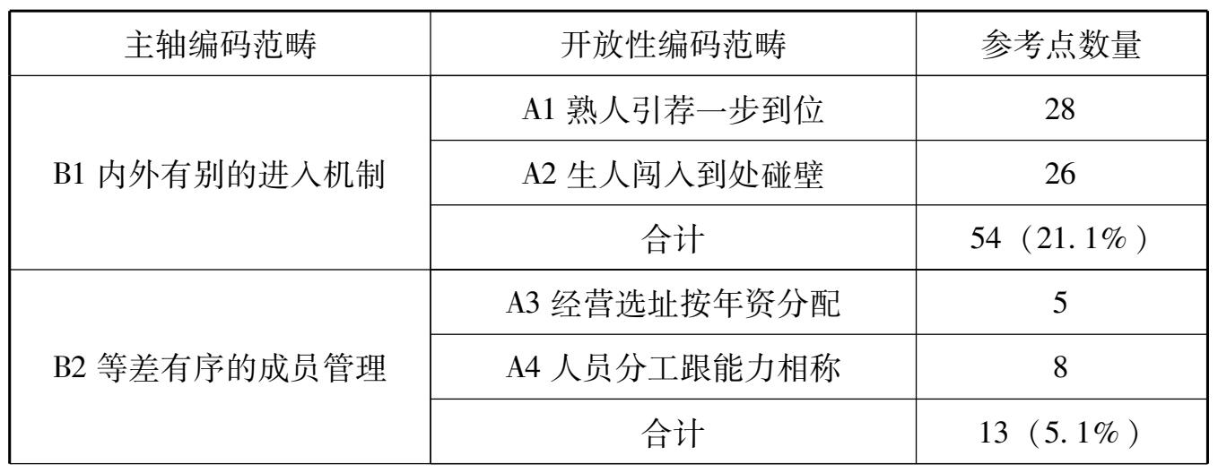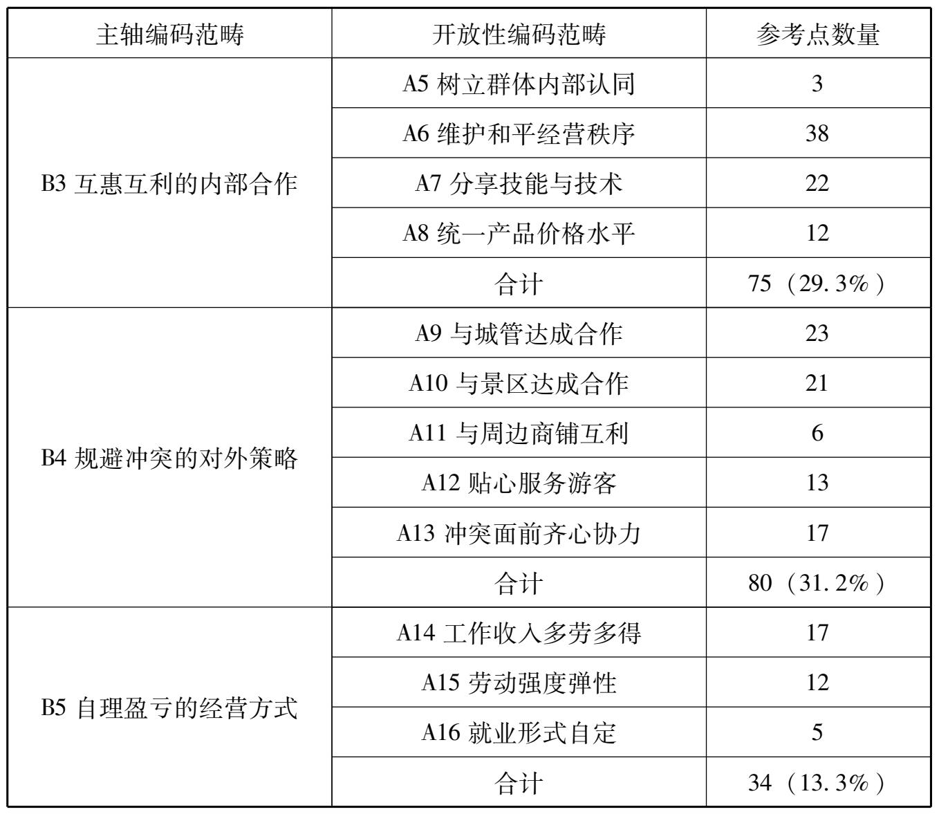 通过仔细梳理开放性编码所形成的范畴的内在关系和本质特征,综合采取多种方法,将开放性编码得到的自由节点“A1熟人引荐一步到位”“A2生人闯入到处碰壁”2个自由节点归纳到“B1内外有别的进入机制”这一树状节点中;将“A3经营选址按年资分配”“A4人员分工跟能力相称”2个自由节点归纳到“B2等差有序的成员管理”这一树状节点中;将“A5树立群体内部认同”“A6维护和平经营秩序”“A7分享技能与技术”“A8统一产品价格水平”4个自由节点归纳到“B3互惠互利的内部合作”这一树状节点中;将“A9与城管达成合作”“A10与景区达成合作”“A11与周边商铺互利”“A12贴心服务游客”“A13冲突面前齐心协力”5个自由节点归纳到“B4规避冲突的对外策略”这一树状节点中;将“A14工作收入多劳多得”“A15劳动强度弹性”“A16就业形式自定”3个自由节点归纳到“B5自理盈亏的经营方式”这一树状节点中,具体见表1-5。