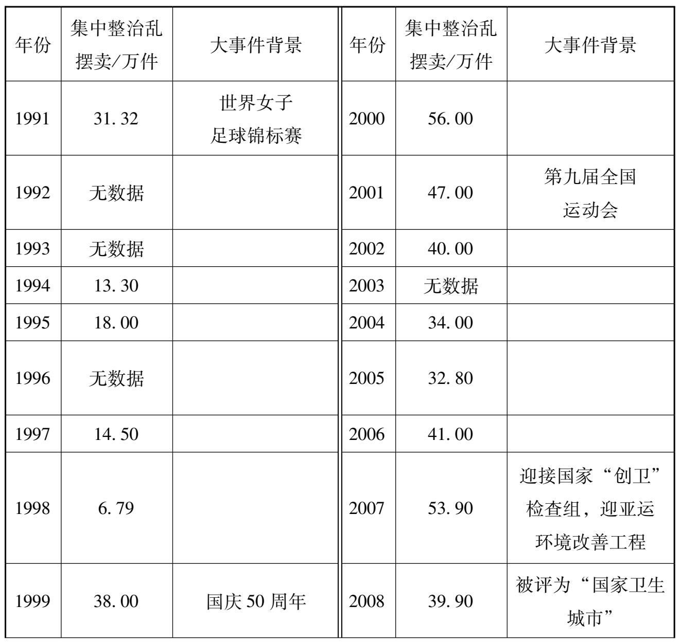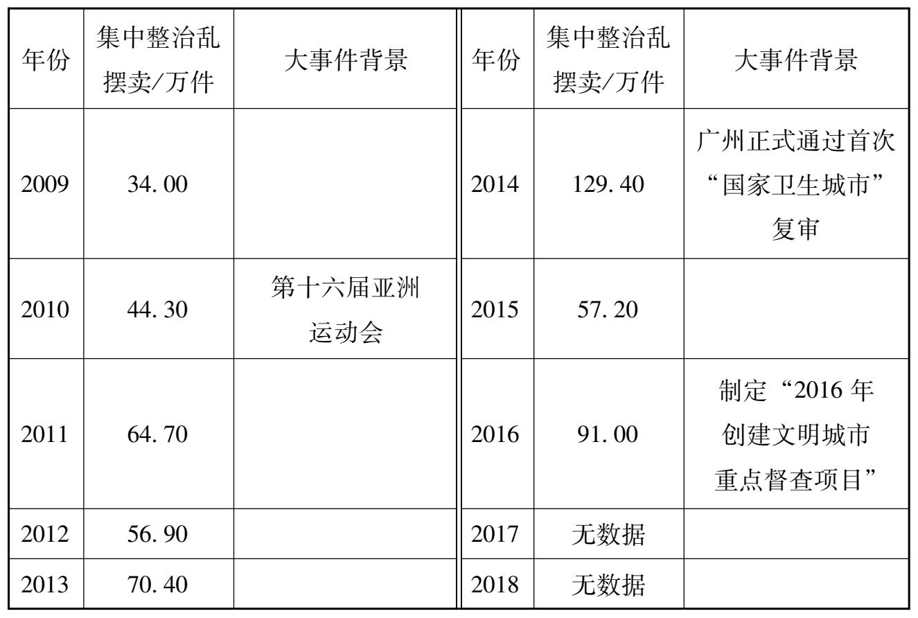 表1-1 1991—2018年广州市集中整治乱摆卖及大事件背景