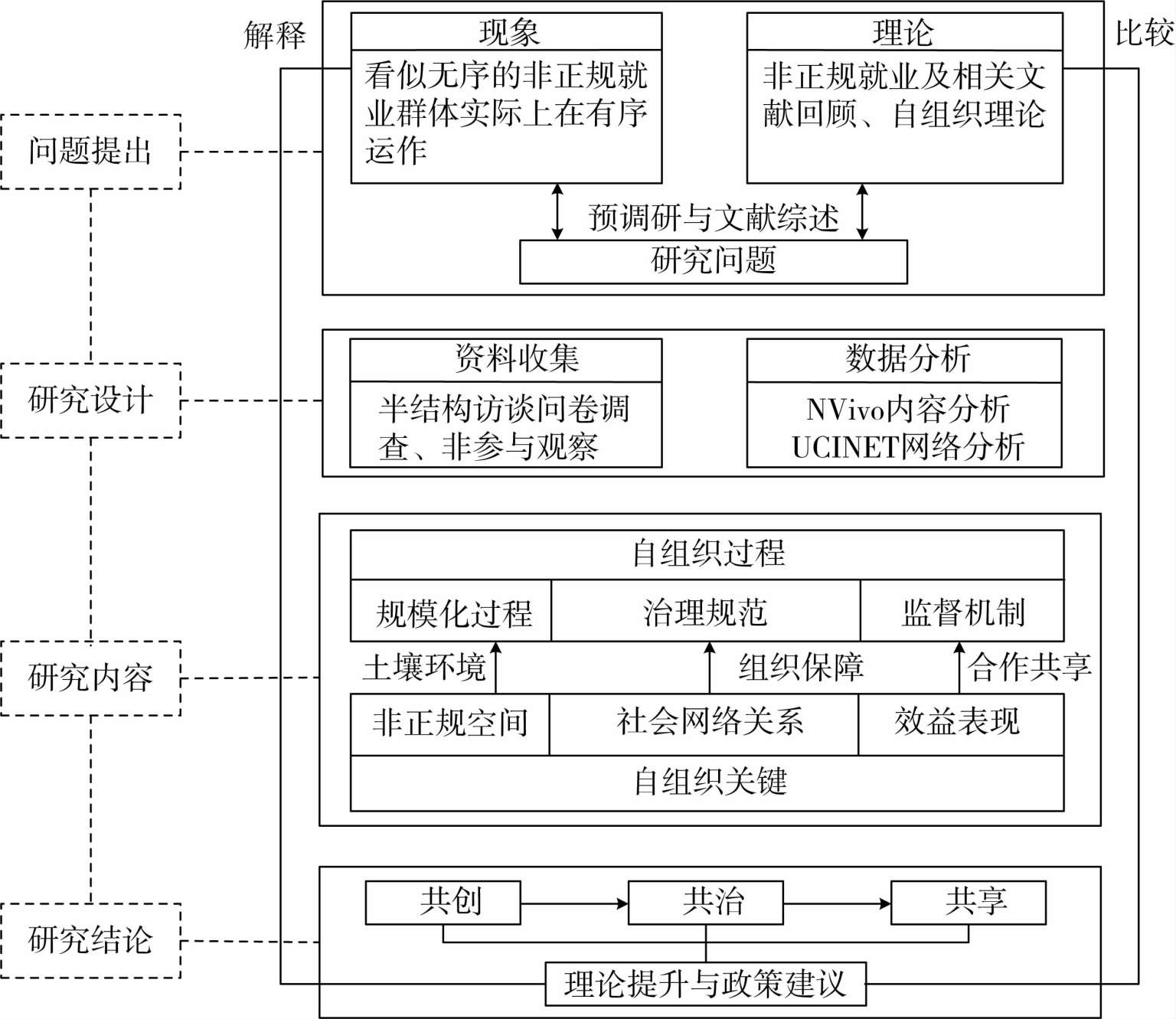 本研究按照相应的技术路线(见图1-1),通过对群体自组织的整体历程、保障支撑与合作共享展开分析,力求在非正规群体生长演化过程中更好地解读其内部组织特征,形成对现有理论研究的呼应与补充。