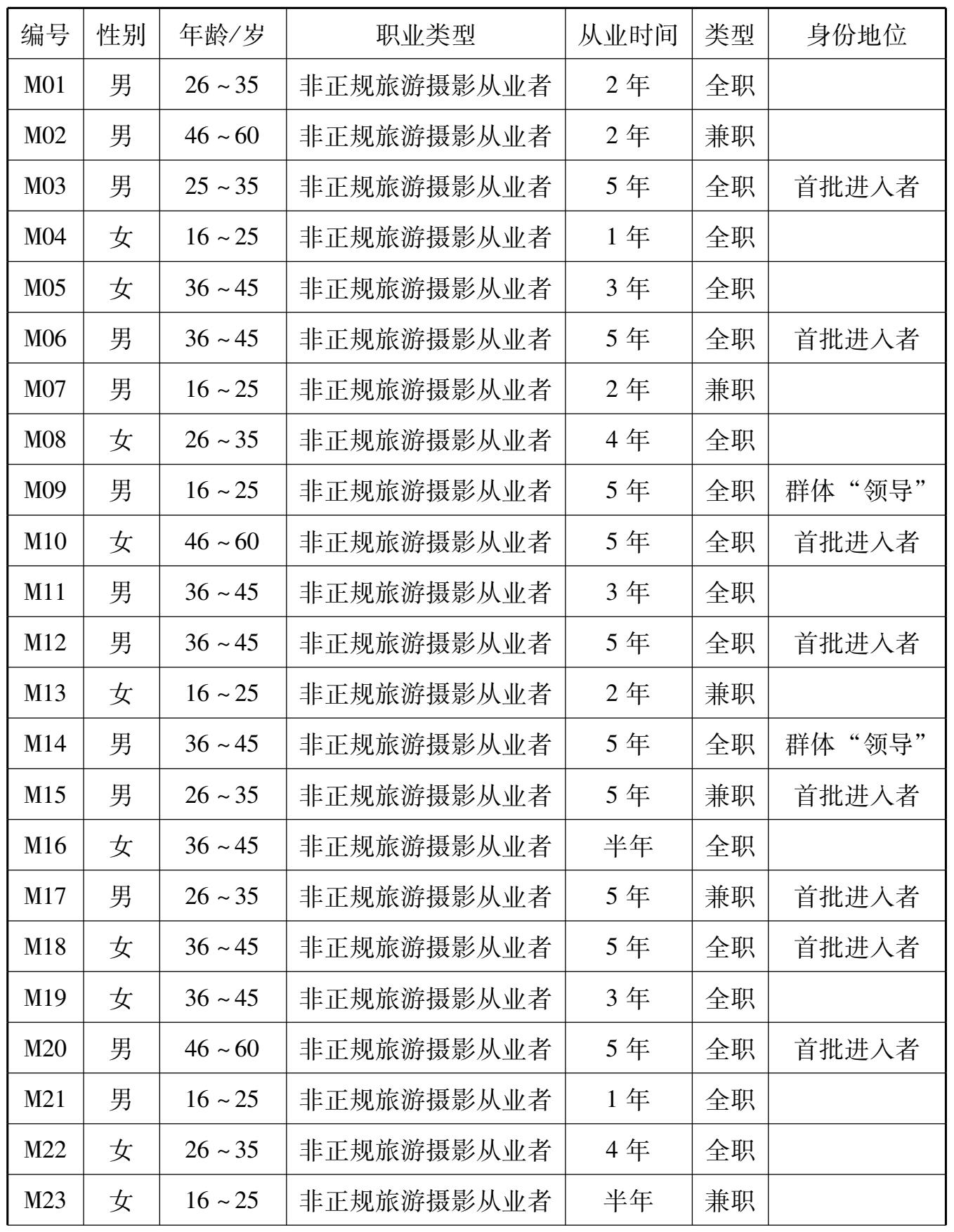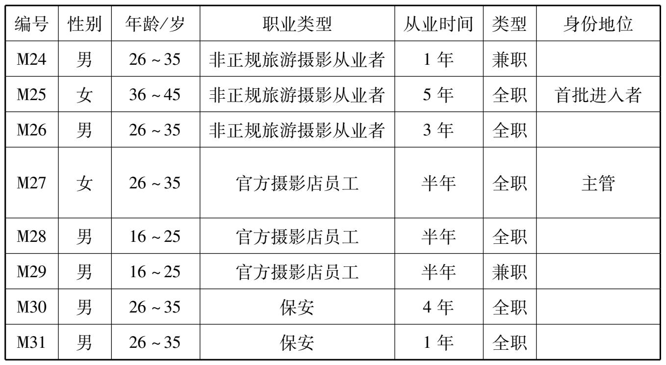 正式调研阶段,以群体的自组织为研究主题,主要通过半结构访谈和非参与式观察等方式了解非正规旅游摄影从业者群体实现自组织的演化、规章制度及奖惩方式,以还原该群体的自组织全过程。正式调研阶段依然以非正规旅游摄影从业者群体为主要研究对象,完成了 18人的访谈,并在不同时间、不同地点分别进行了 9次调研。