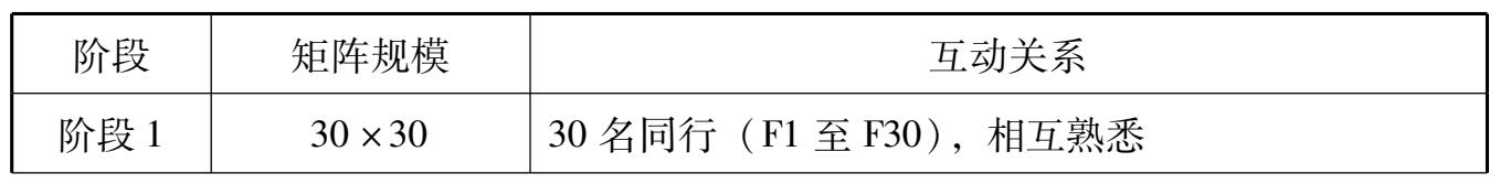 广州塔周边的非正规旅游摄影从业者的自组织过程实际上就是社会网络不断发展的纵向过程,具有重要的借鉴作用。然而,由于社会网络关系涉及非常隐私的问题,再加上旅游非正规群体与生俱来的“排外性”,本书难以通过完善的社会网调查问卷来还原广州塔周边的非正规旅游摄影从业者的网络演变。因此,本书将通过“线人”的方式收集资料,即研究者通过与多个线人进行长时间访谈,记录被研究对象之间的各种社会关系,构建关系矩阵并进行分析 [29] 。通过对“胖子”“王哥”等多名首批进入者进行访谈,模拟出三个重要阶段分别为 30×30、50×50、100×100的互动关系矩阵,并通过UCINET 6.0网络分析工具对互动关系矩阵进行数据处理,分析经过具体见表1-6。