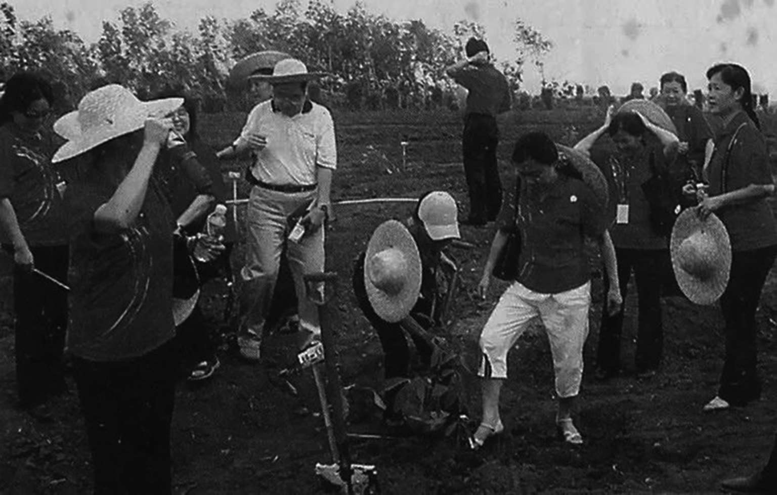 作者陈韩星(中间穿白衣、戴眼镜者)与当年的广州军区生产建设兵团政治部文艺宣传队队员们一起种植胶苗