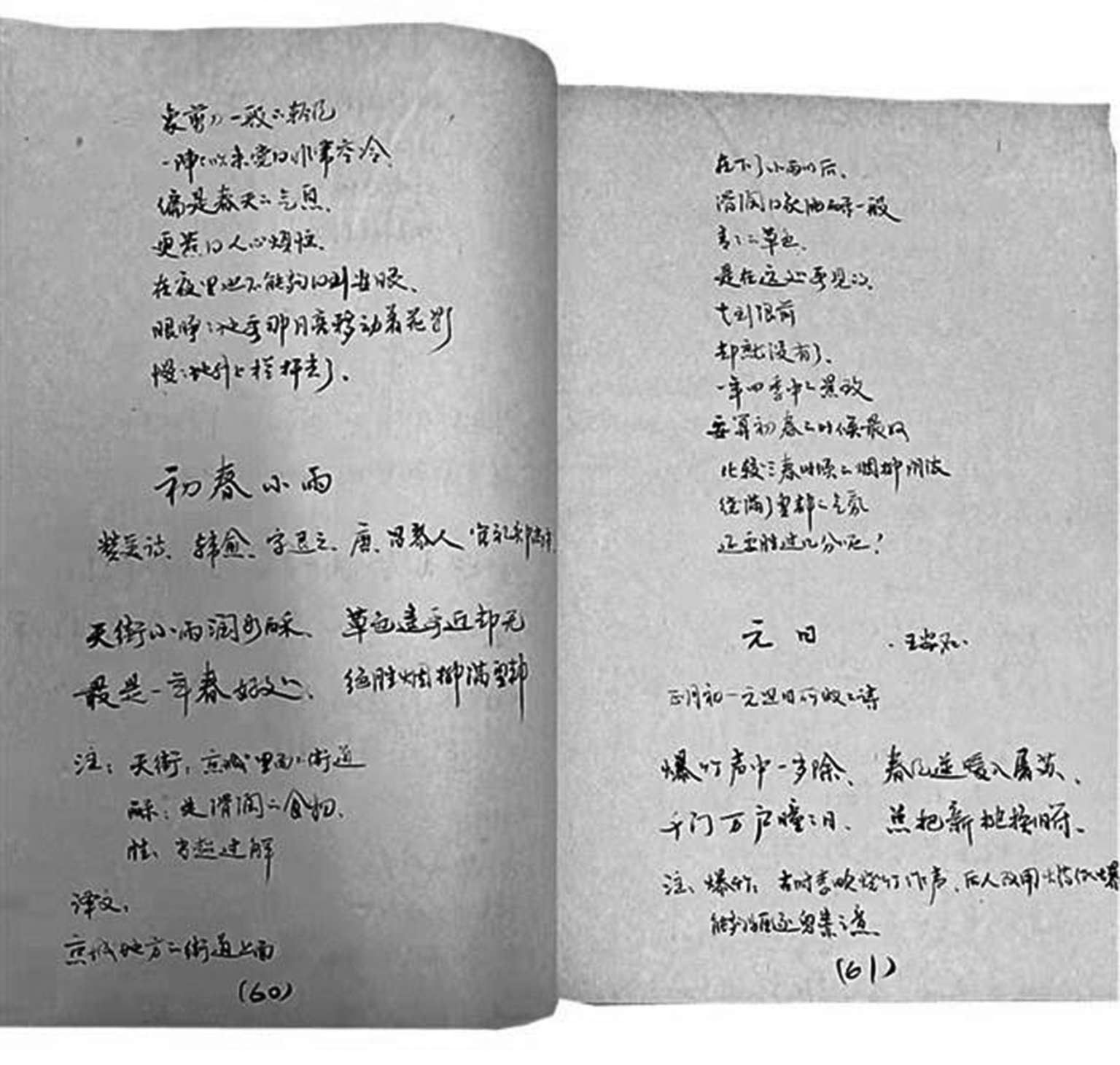 当时我第一个念头就是要把它抄下来!我要一笔一画地把这么珍贵的《千家诗》和《唐诗三百首》整本都抄下来。我对徐老师说:“徐老师,我想把这两本诗集都抄下来,好吗?”徐老师说:“当然好啊!抄书本来就是读书人应该经常做的事情,抄书可以加深印象,还可以收心练字。”说到练字,我进一步想,我不是在学毛笔字吗?干脆就用毛笔抄,虽然要花更大功夫,但可达到双倍的功效啊。