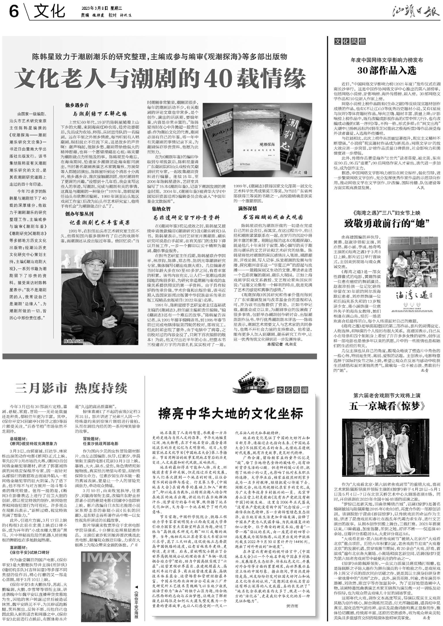 今年70多岁的陈韩星与潮剧结下了40载的深厚缘分,他致力于潮剧潮乐的研究整理工作,主编或参与编审了《潮剧年鉴》《潮剧研究》《潮剧志》等多部地方历史文化出版物;经潮汕历史文化研究中心策划主持,主编了《潮汕戏剧大观》。一系列书籍为潮剧留下了珍贵的资料。接受采访时陈韩星表示:“我不是潮剧团的人,我常说自己是潮剧‘边缘人’,为潮剧所做的一切,皆因心中那份责任感。”