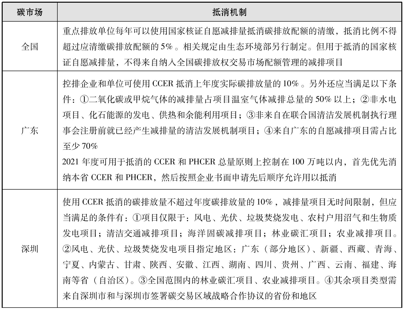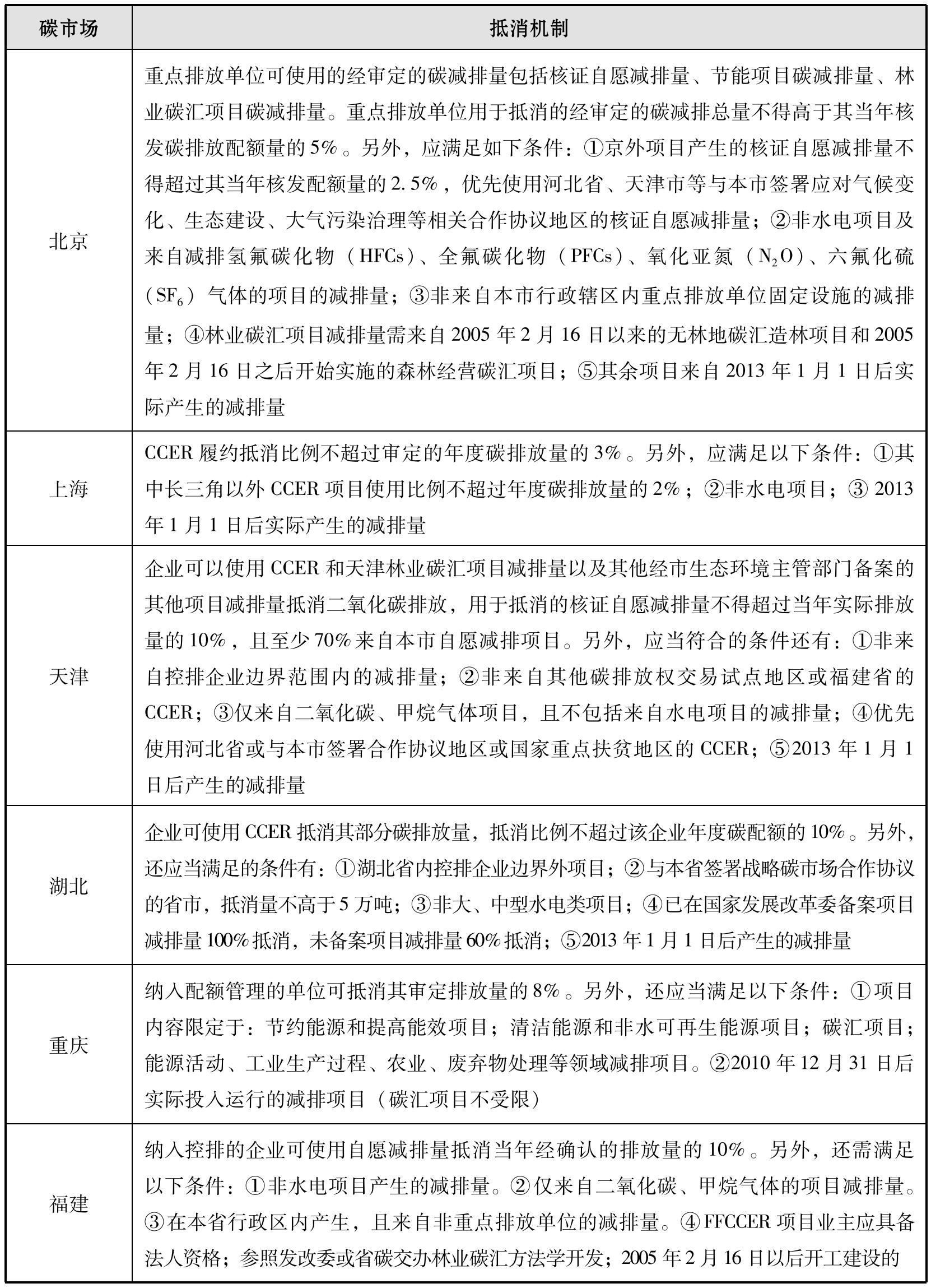 所有碳市场在履约时都可采用核证自愿减排量充当配额以抵消实际排放量,可使用的核证自愿减排量一般包括CCER 和各试点碳市场开发的减排量,如广东的碳普惠核证自愿减排量(PHCER)、福建的林业碳汇减排量(FFCER)等。不过,各试点在采用核证自愿减排量进行抵消时,均有一定的限制,包括限制可抵消的比例,可使用CCER 的项目类型、产生时间、产生项目属地等。此外,试点碳市场为鼓励当地范围内的减排项目,会优先考虑当地项目产生的减排量,或者对当地的区域级核证自愿减排量降低限制比例等。