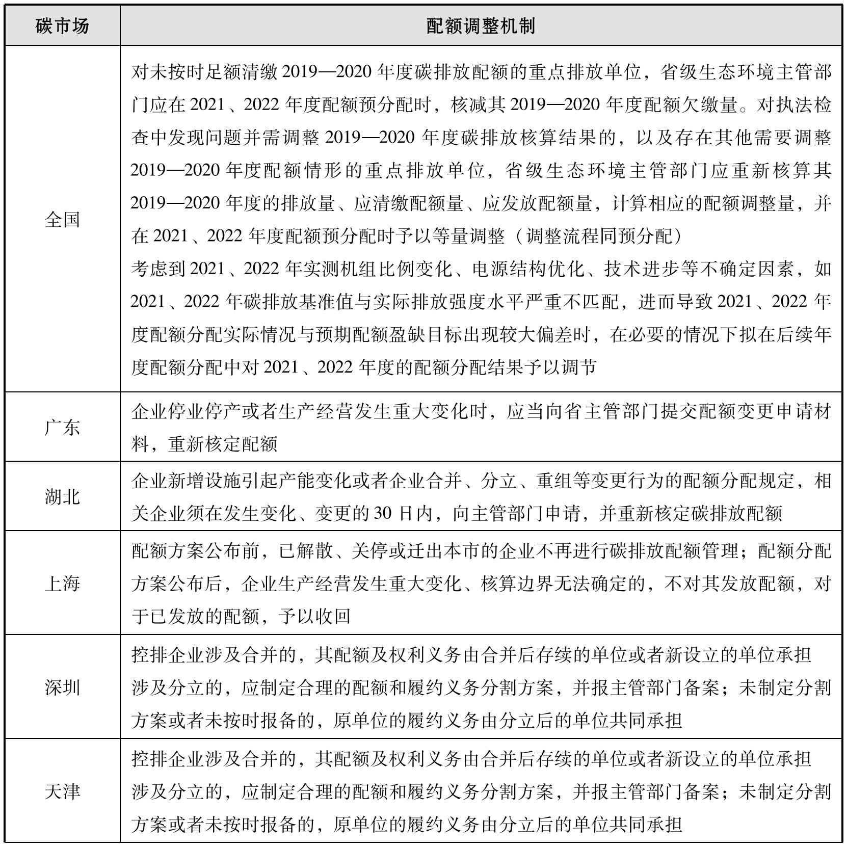 由于控排主体的生产计划和产能水平是不断变化的,各试点地区也对配额发放的数量调整作了相应规定,特别是企业改制、改组、兼并和分立、新建、改扩建等情况,均会导致企业配额的调整。一般情况下,对于企业生产经营发生重大变化的,各碳市场均会对企业的配额重新进行核定,对于企业治理结构发生变化的,如合并或者分立,主管部门均明确规定了各自的权属关系,如配额和履约义务的继承。详见表3-8。