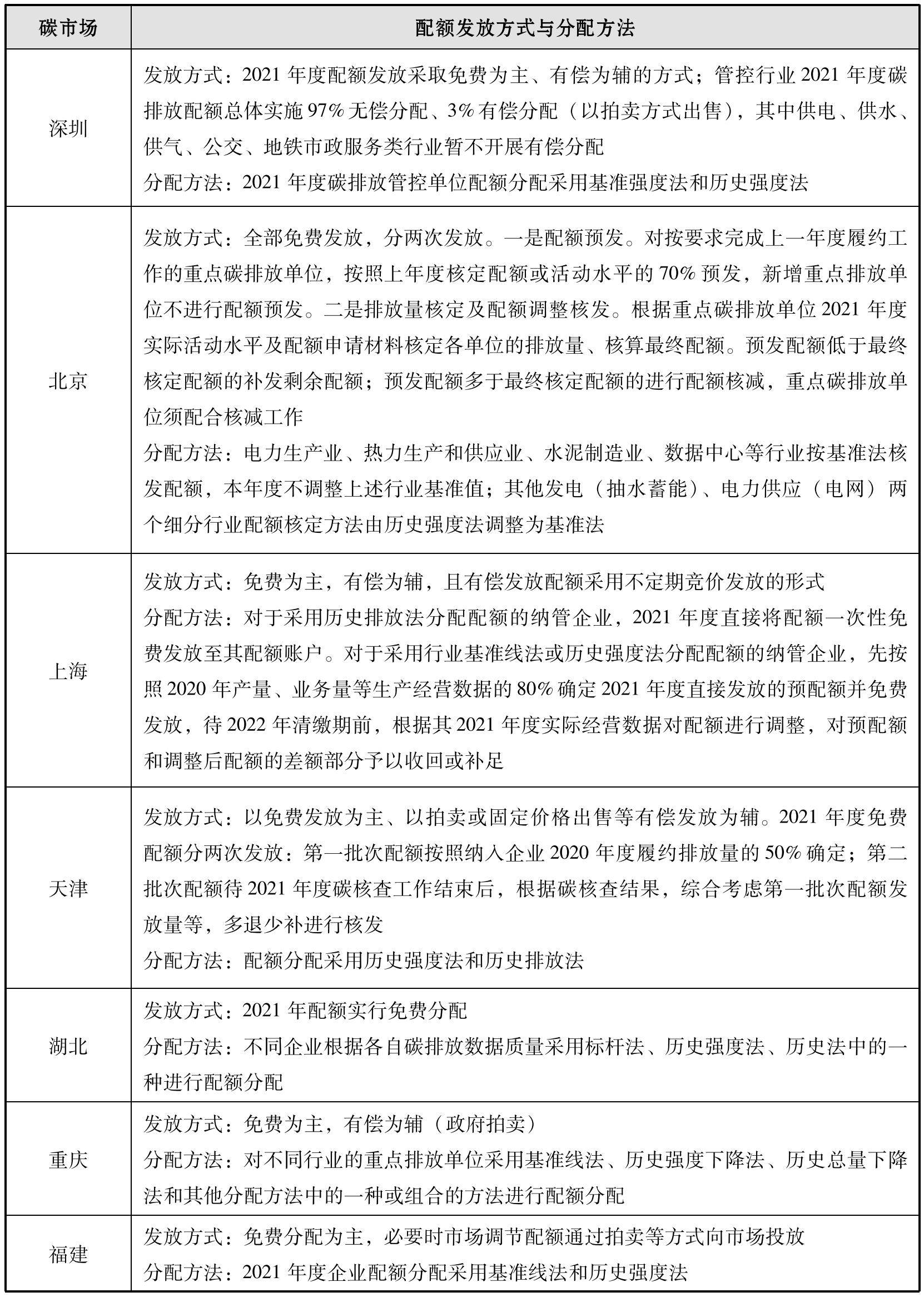 在配额结构方面,各碳排放权交易市场设置情况大体相似。一般而言,配额分为控排企业(纳入碳排放权交易体系的企业)配额和储备配额,控排企业配额是通过有偿或者免费方式发给企业的配额,储备配额是政府给新增设施、新进入者以及调整市场价格等预留的配额,主要用途是防止市场冲击。就储备配额具体分配而言,各试点地区有一定的差异。另外,即使是在同一试点地区,不同行业的配额构成也有所差异。