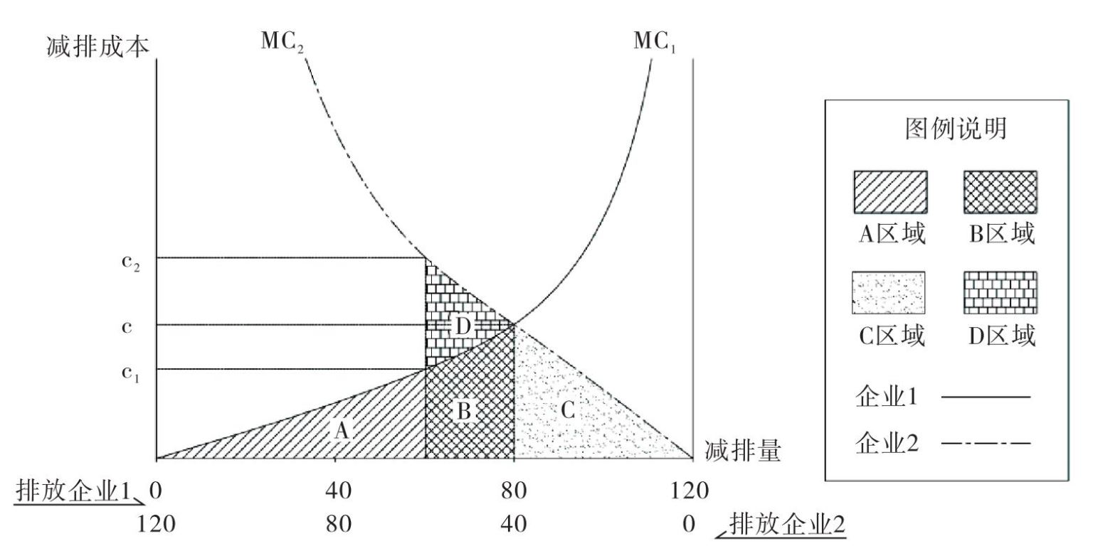 图3-1明确地表明在两条减排成本曲线 MC 1 和 MC 2 的交点处,最优地实现了企业1和企业2的减排责任分担。企业1减排 80个单位,企业 2减排40个单位,此时两企业的边际减排成本相等,实现减排目标的减排总成本最小。两曲线与横坐标轴之间所谓的面积A+B+C代表两企业的减排总成本,其中A+B的面积代表企业1的减排成本,C的面积代表企业2的减排成本。其他的减排责任分配方案都将导致减排总成本的增加。譬如,分配给企业1的碳减排量是60个单位,分配给企业2的减排量也是60个单位。此时,企业2 的边际减排成本C 2 高于企业1的边际减排成本C 1 ,如果没有碳排放权交易的发生,双方在既定分配目标下实现的总成本是A+B+C+D,大于最优分配处实现的总成本。其余情形依此类推。