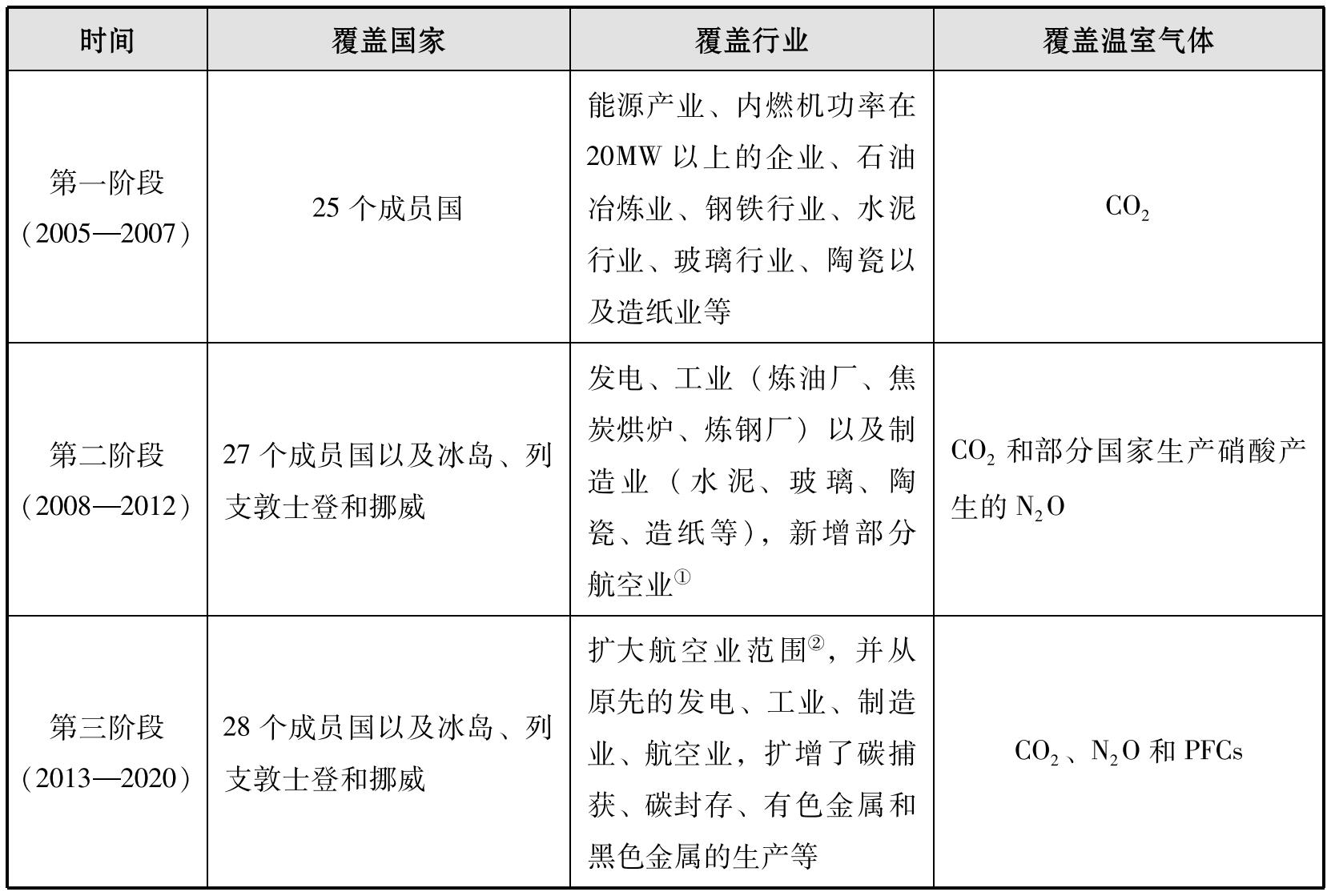 第一阶段为试验阶段,自2005年1月1日至2007年12月31日。此阶段的主要目的并不在于实现温室气体的大幅减排,而是获得运行总量控制与交易机制的经验,为后续阶段正式履行《京都议定书》奠定基础。在选择所交易的温室气体方面,第一阶段仅涉及对气候变化影响最大的二氧化碳的排放权的交易,而不是全部包括《京都议定书》提出的六种温室气体。