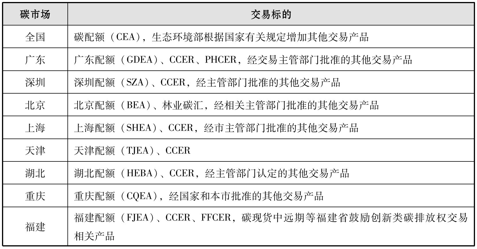 目前各碳市场开展的碳排放权交易的交易标的均以碳排放权配额为主。此外,各试点碳市场也预留了推出新交易标的的政策空间,如北京、广东、深圳、上海和重庆均在交易所规则里加入了交易标的还包括“经相关主管部门批准的其他交易品种”的规定,方便推出满足不同需求的交易品种,以增强碳排放权交易市场的流动性。各碳市场的交易标的见表3-11。