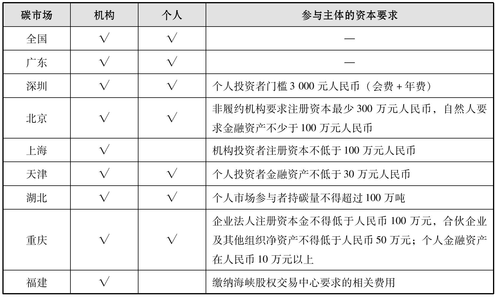 注:全国碳排放权交易市场因正式开始交易时间尚短,目前实务中机构投资者和个人还未正式参与碳排放权交易。