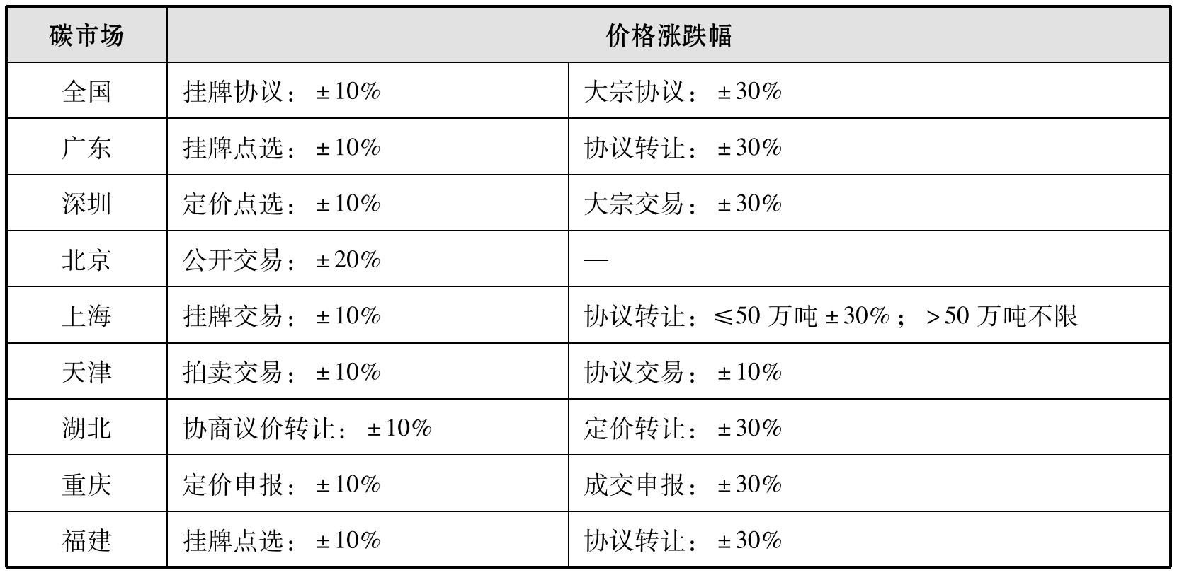针对交易价格的涨跌幅限制,各碳排放权交易市场的规定存在较大差异。全国碳排放权交易市场设定挂牌协议转让为±10%、大宗协议交易为±30%;广东设定挂牌点选交易为±10%、协议转让交易为±30%;深圳设定定价点选交易为±10%、大宗交易为±30,但采用电子竞价方式进行的交易不实行价格涨跌停限制;上海设定挂牌交易为±10%、对50万吨以内的协议转让设定±30%的涨跌幅度,50万吨以上的协议转让不设涨跌幅限制;北京设定公开交易方式的涨跌幅为当日基准价的±20%;湖北设定协商议价转让交易为±10,定价转让交易为±30%;天津设定涨跌幅限制为±10%;重庆则规定定价申报方式价格涨跌幅为±10%、成交申报(类似协议转让)价格涨跌幅为±30%;福建规定挂牌点选的价格波动范围为±10%、协议转让的价格波动范围为±30%。具体见表3-13。