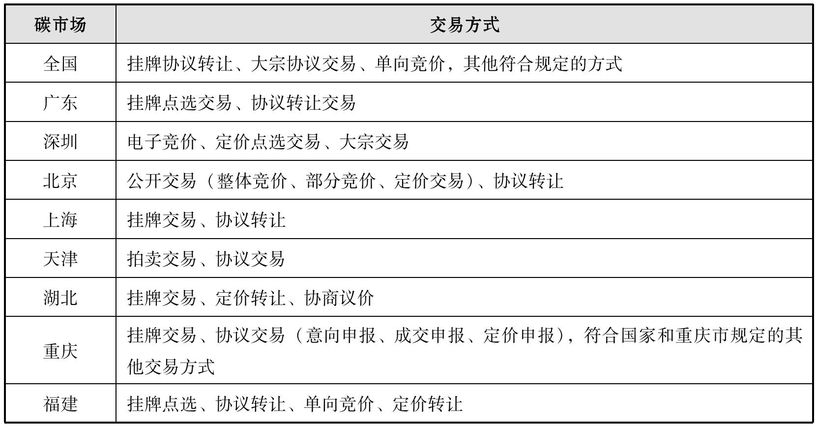 碳排放权交易市场的交易方式主要分为线上公开交易与协议转让交易两种。但试点碳排放权交易市场针对公开交易推出了众多交易方式,如广东碳排放权交易市场的公开交易方式有一级市场的有偿发放竞价交易、二级市场的挂牌点选交易及协议转让等。相对丰富的交易方式能满足投资者的不同需求,有利于增强碳排放权交易市场的流动性。有偿竞价、挂牌点选或者其他的竞价交易都是通过线上交易系统进行,而类似于协议转让的交易方式需交易双方先进行线下协商,然后再通过碳排放权交易所挂牌完成交易。