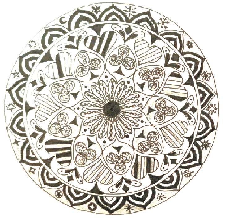 画完之后,观看自己所画的曼陀罗图案,回想绘画时候的心情。然后,拿笔记下对所画作品的体验、联想和感悟。最后给画进行命名,并注明日期。