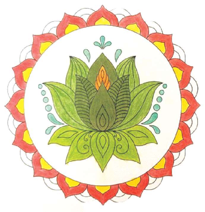 可以将完成涂色的曼陀罗放到自己面前,去观想曼陀罗,或者试图走进其中的世界,用内心与它对话。然后,在图案的空白处,写下每种颜色所象征的意义。最后,可以给涂色图案进行命名,并注明日期。