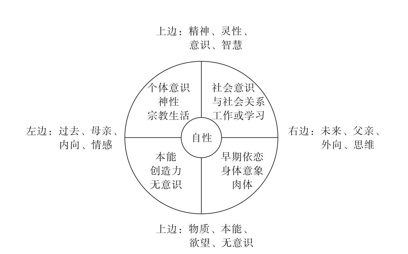 根据经验和相关分析心理学学派的理论可知,曼陀罗的“上”往往代表着精神、意识、灵性和智慧,“下”代表着物质、无意识、本能和欲望,“左”代表着过去、母亲、内向和情感,“右”代表着未来、父亲、外向和思维,中心是自性某个功能的意象性表达(见图3-5)。此外,这些结构还需要针对具体情况进行具体分析,并非固定不变。