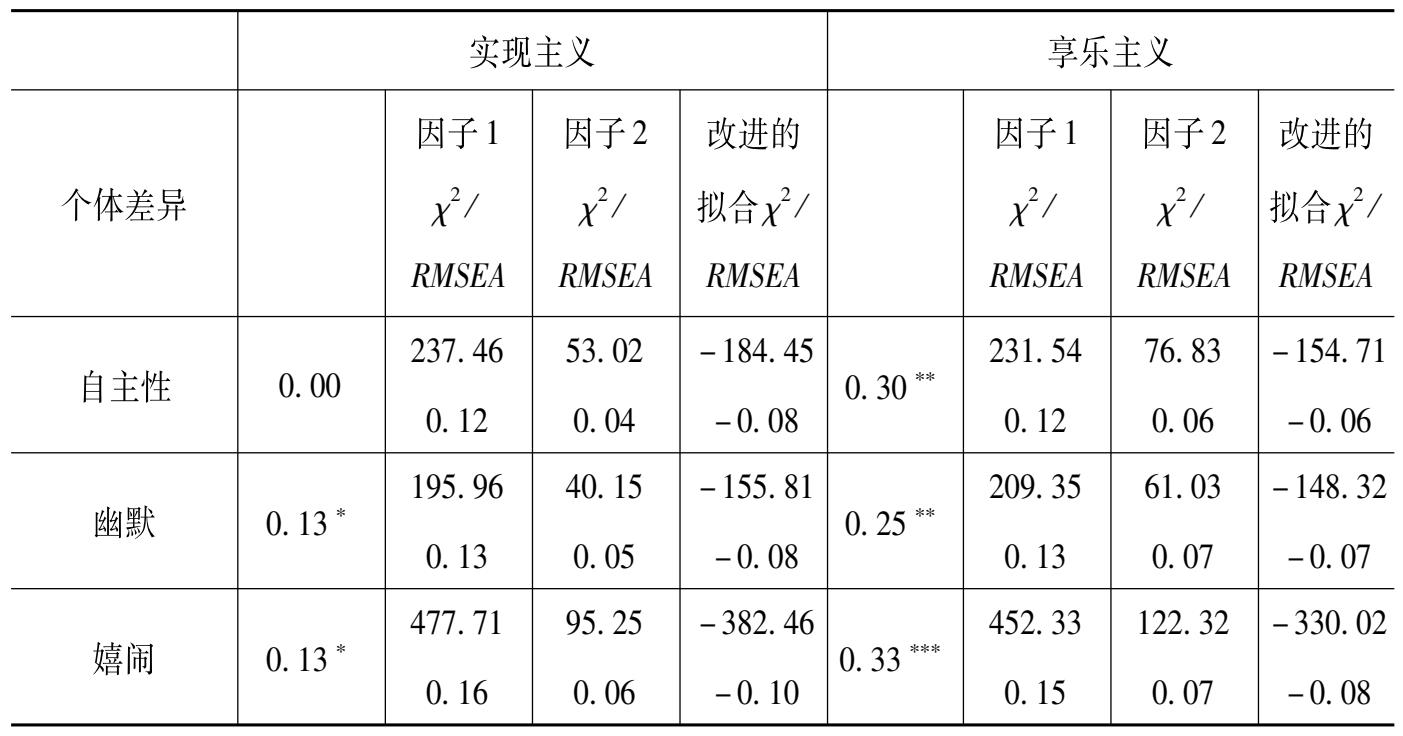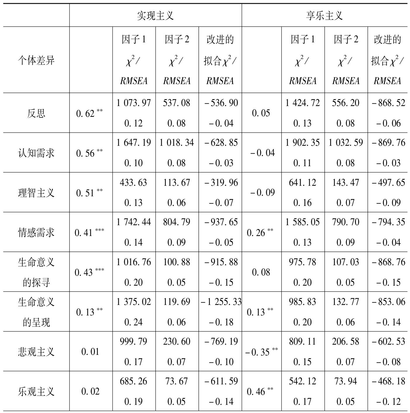 (2)聚合效度和区分效度:验证性因子分析法被应用于检验个体差异变量(详见Hayes,Glynn & Shanahan,2005)的实现主义与享乐主义量表的聚合效度和区分效度。聚合效度的检测是通过享乐主义以及实现主义的潜变量和每一个个体差异变量之间的相互关系来完成的,计算出潜变量与误差方差之间的协方差为1(见表2)。为了建立区分效度(即实现主义和享乐主义与个体差异变量有所不同),潜变量之间的协方差(误差方差为0)被限制为1。这个限制等同于变为单因子模型。因此,对适合度统计量和因子1、因子2之间的差异进行了计算。因子1和因子2模型之间在适合度方面的显著改进表明,潜变量是唯一的,从而提供了判别有效性的证据。