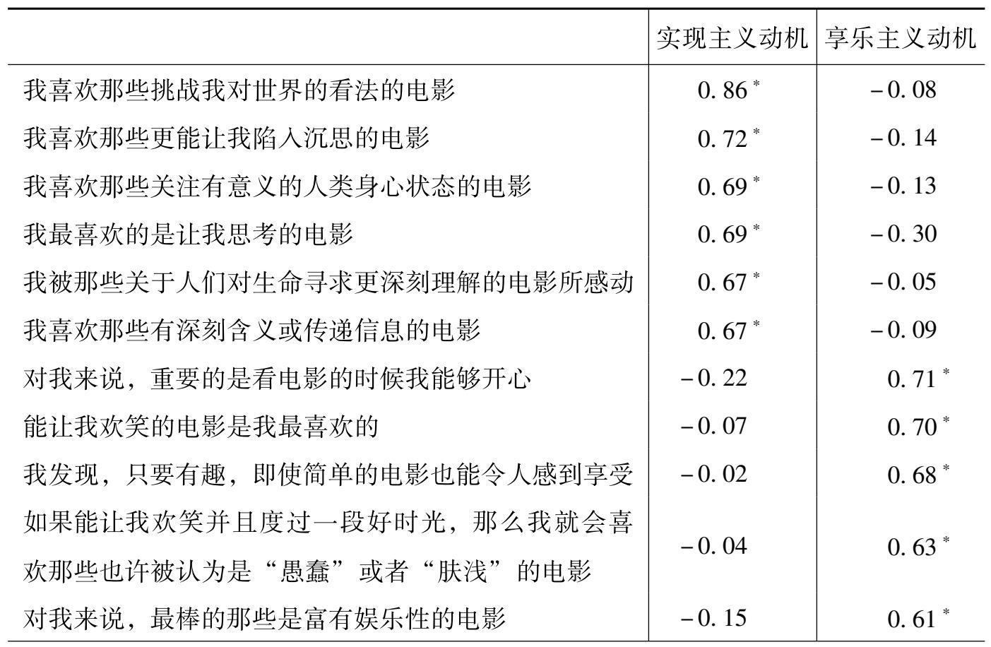 为了评估享乐主义和实现主义量表所推断的不同的娱乐偏好模式的程度,参与者被要求使用量表范围1(完全不)~7(非常),并从网络电影数据库中找出他们喜欢的12种不同类型的电影。为了分析类似电影类型的子组,这12种类型的评分被提交用于主成分分析。该分析显示了5个特征值大于1的因子,占总方差的74.37%。第一个因子称为“非虚构类”,包括传记、纪录片和历史电影( M =3.83;SD=1.41;α=0.82);第二个因子称为“剧情片”,包括戏剧、悲剧电影和浪漫故事( M =4.45;SD=1.35;α=0.75);第三个因子称为“科幻类”,包括科幻和奇幻电影( M =4.10;SD=1.62; r =0.59);第四个因子称为“恐怖电影”,包括恐怖片和惊悚片( M =4.82;SD=1.52; r =0.49);第五个因子是“有趣的电影”,包括喜剧和动作片( M =6.07;SD=1.03; r =0.35)。然而,考虑到对喜剧的喜爱和对动作电影的喜爱之间的细微关联,这两种类型被分别作为单题项测量量表加以分析。