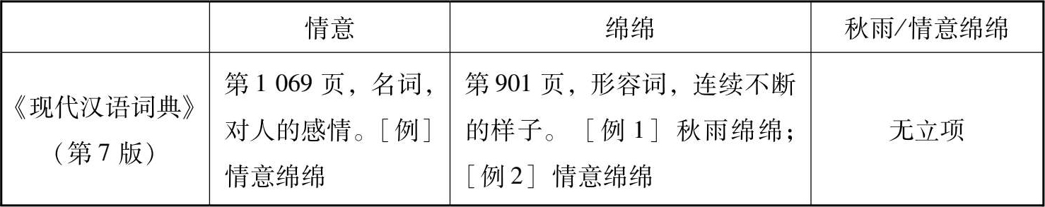表2 《现代汉语词典》(第7版)中“情意”“绵绵”“秋雨/情意绵绵”的释义