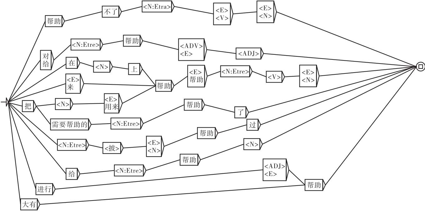 ③我们设定对外汉语常用动词为500个,常用句法特征集为100项,数量上是足够的。这些信息都可以用有限状态图直观地标示出来。这种词汇—语法的信息管理方式十分具有优势,例如,转化空间大。