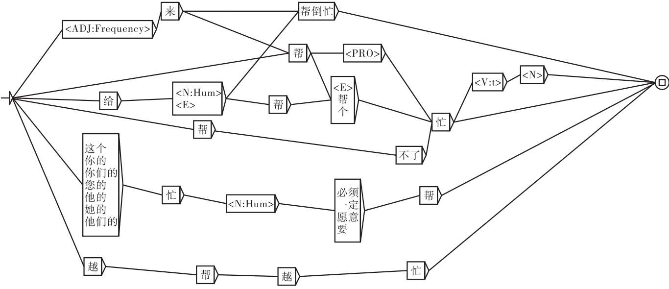 关于“有限状态图”,见郑定欧(2012)。这里需要说明的是,有限状态图的制作完全有赖于中国人民大学的张同学(Cheryl Zhang Xian-fan)的协助才得以完成。2016年5月底本人造访法国东部大学IGM学院的时候,偶遇当时就读于巴黎第三大学的张同学。由于学习上的缘故,她碰巧也在IGM学院学习词汇—语法,而她很乐意利用特殊的软件绘制出相关的有限状态图(见图1、图2)。