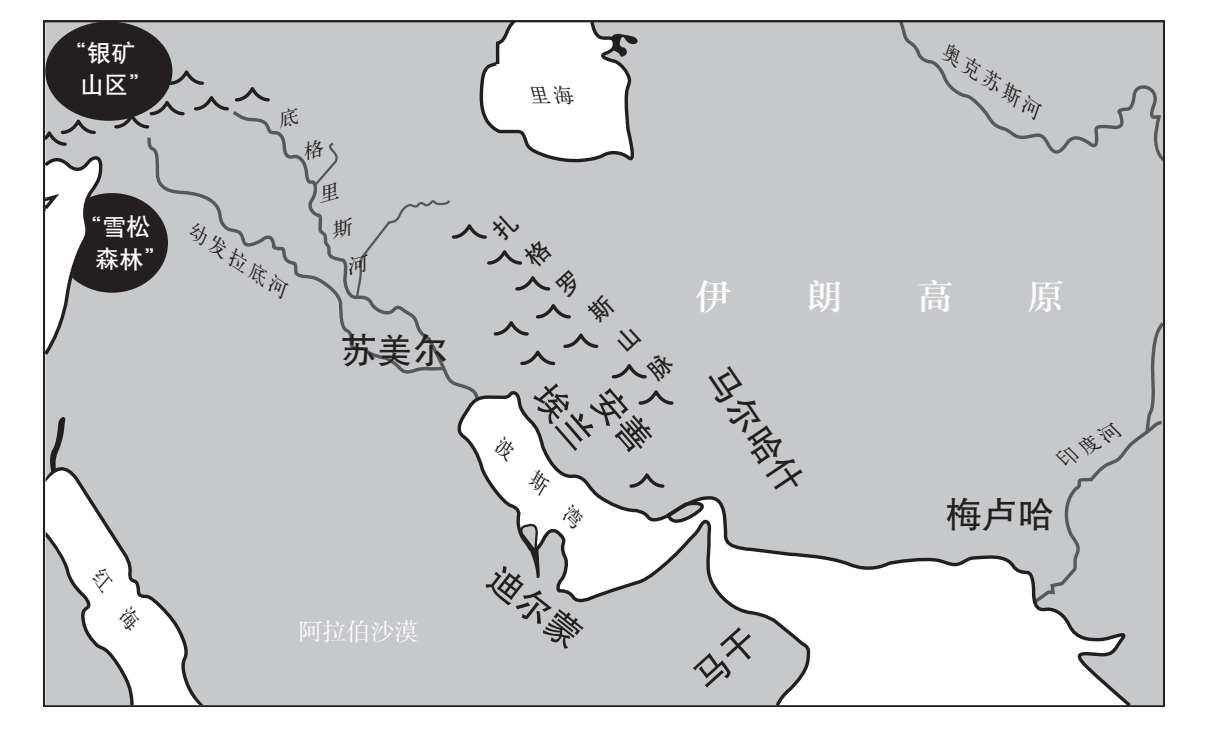从公元前三千纪晚期开始,美索不达米亚王室碑文上的文字就经常宣称征服了“从下海到上海的所有民族和山地”,“下海”“上海”分别指的是波斯湾和里海的水域(也有可能是西面的奥鲁米耶湖)。“雪松森林”和“银矿山区”则确定了宇宙的北方界限,它们是壮烈战役和超自然遭遇发生的地方,凡人无法到达。主要的海上竞技场在南方,在“下海”内外。公元前四千纪末期的楔形文字文献中已经提到过“迪尔蒙”这个名字,它在不同时期指的是巴林和塔鲁特的岛屿,以及毗邻波斯湾中部的阿拉伯沿岸地区;到公元前三千纪末期,又增加了更远的地方:马干(铜矿丰富的阿曼湾)和梅卢哈(很可能是莫克兰山脉和印度河河口之间的沿海地带,被认为是象牙、青金石、红玉髓、黄金和上等木材等外来商品的供应地)。在美索不达米亚的资料中,埃兰王国(首都位于伊朗西南部低地的苏萨)以及伊朗高地东部偏远的安善和马尔哈什领土,在政治上与苏美尔平原的一众城市旗鼓相当。