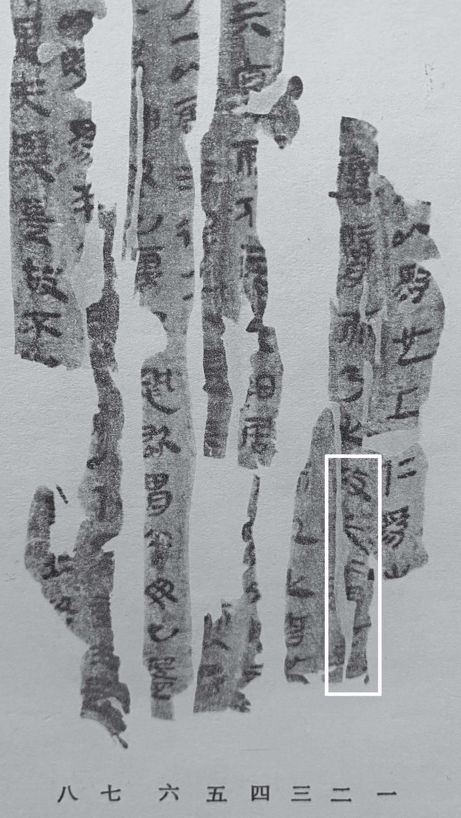按照2014年版《长沙马王堆汉墓简帛集成》中的注释,去掉误缀的小残片,对照图1-4、图1-5右下方框起来的内容,我们还是可以明确发现:第二列文字下方残留的墨迹所代表的“失”“道”“矣”三个字在帛面上的间距,与图版中其他字间距相比,明显宽一些,而这个宽度又没有大到能容下一个字。这就说明在“失”“道”二字之后,誊写者必定留下了某种符号。那么,这个符号究竟是什么呢?