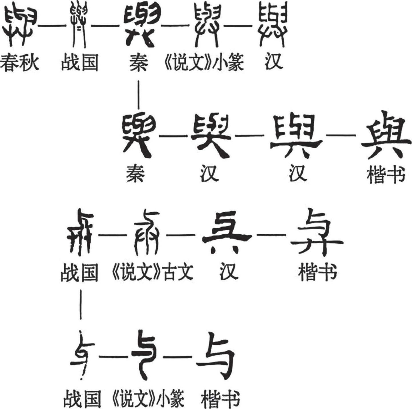 如图2-5所示,“與”和“与”在古汉语中是两个字,同源于“與”字;从战国中后期开始,字形有了分化,到汉代分化成“與”“与”二字;如今“與”字又简化为“与”。