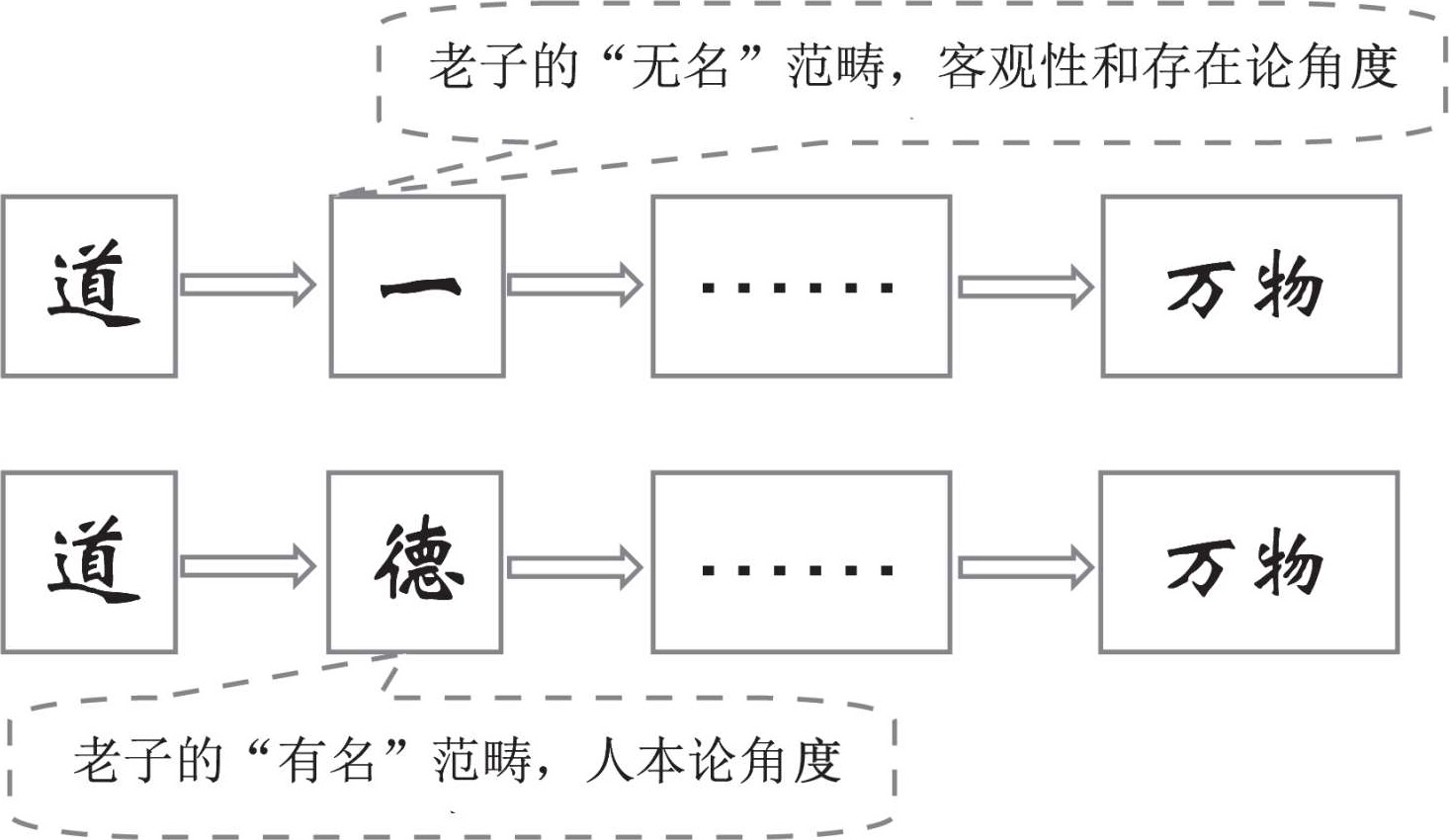 如图2-2所示,在老子的哲学里,“一”与“德”的地位与性质相当,是物质层面的真正开始,都是统领世间万物而不直接生发万物(并非作为原动力、主导与规律的“道”)。