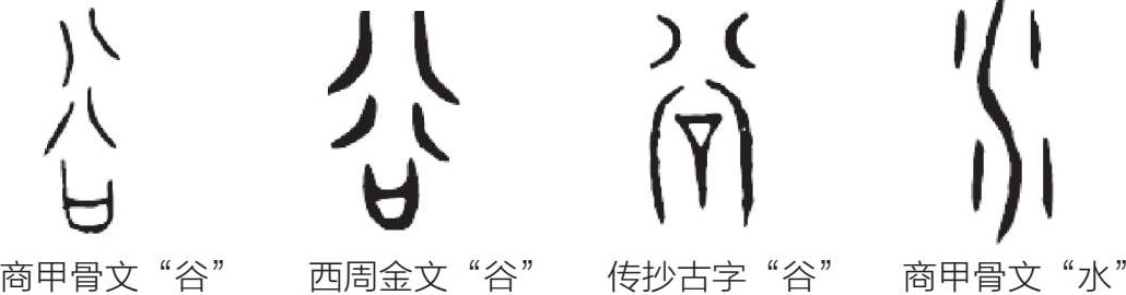由于山谷内少水或无水,故古人造字时将“水”字甲骨文中间的长笔画省去,保留了两旁的笔画,代表小溪流。西周金文、汉代之后传抄的先秦古字“谷”的字形都与甲骨文差异不大,可比对图2-3中“谷”与“水”的字形。这体现出古人造字的智慧。