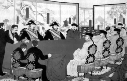 1871年9月,日本与清政府签订中日《友好条约》,意图削弱清朝在朝鲜的影响。1875年4月,日本侵入汉江口,但被朝鲜军民击退。9月,日本军舰再次闯入汉江口。第二年2月,日800名士兵在江华岛登陆,勒令朝鲜与之谈判。同月26日,朝鲜被迫在《江华条约》上签字,沦为日本的殖民地。《江华条约》签订以后,日本加紧了对朝鲜的经济掠夺和政治渗透,并按照日本模式对朝鲜军队进行改编。日本军官对朝鲜士兵的虐待,引起了“壬午兵变”(1882年4月)。之后,日本使用武力强迫朝鲜政府签订《济物浦条约》,同意它在朝鲜驻军的要求。