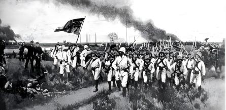 帝国主义的侵略行径,使得以慈禧太后为首的后党集团对义和团的态度发生转变,企图“用拳灭洋”,以维护其统治地位。慈禧任命支持义和团的端王载漪总理各国事务衙门,并调董福祥部武卫后军入京,配合义和团行动。6月10日,驻天津租界的八国联军2000余人在英国海军中将西摩尔率领下,分批乘火车向北京进犯,揭开了八国联军侵华战争的序幕。侵略军在廊坊、落垡、杨村等地遭到义和团与清军的阻击围攻,死伤惨重,被迫败回天津。正当西摩尔联军受阻于廊坊地区时,17日,联军以水陆夹攻战术突袭天津大沽口炮台。天津镇总兵罗荣光率部顽强抵御,因兵力薄弱,腹背受敌,炮台相继失守。21日,清政府正式向列强宣战。