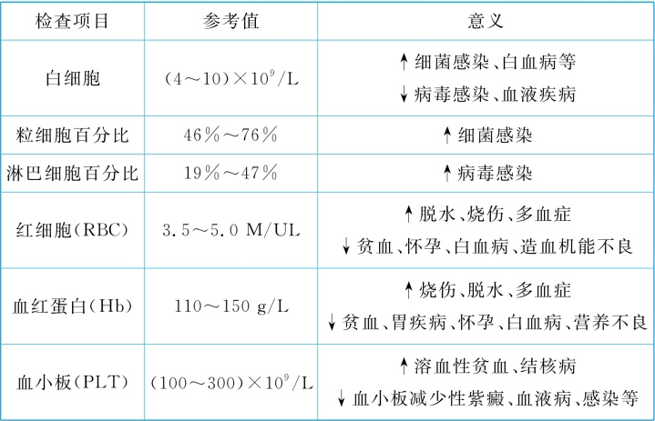 血常规中主要检验项目是血红蛋白、白细胞和血小板。血红蛋白若明显低于参考值属于贫血表现,需要进一步查找原因;血小板数值高于正常值过多,可能引发心肌梗死等疾病,需要进一步检查;白细胞升高往往是因为出现了细菌性感染,导致各身体器官和组织出现急性或慢性感染、炎症等情况。
