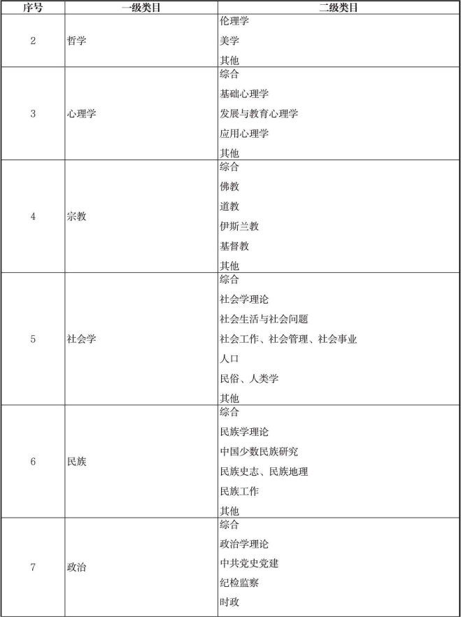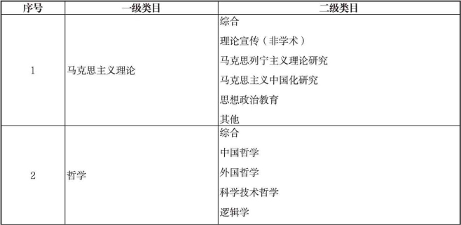 哲学社会科学学术类——指刊发哲学社会科学学术研究成果的期刊,下分“综合类”“专业类”2个二级类目,其中“综合类”二级类目又下分“大学学报类”“党校、行政学院学报类”“社科院(联)综合性期刊类”和“其他类”4个三级类目;“专业类”二级类目又下分“大学学报类”“社科院(联)专业性期刊类”和“其他类”3个三级类目。