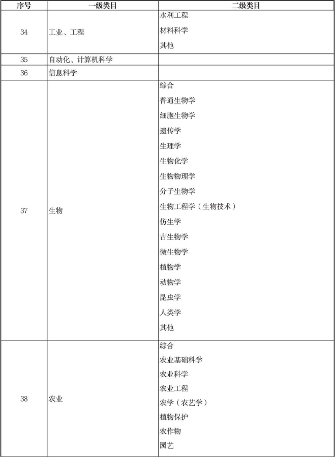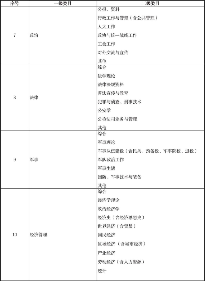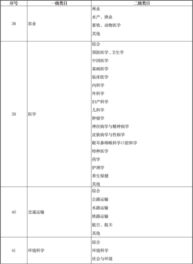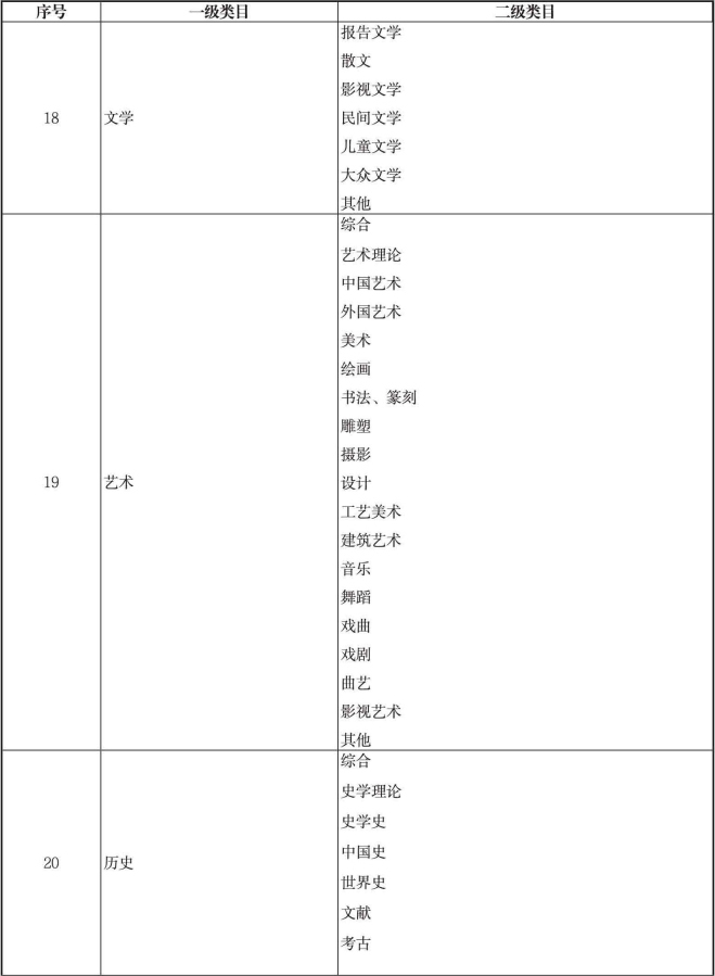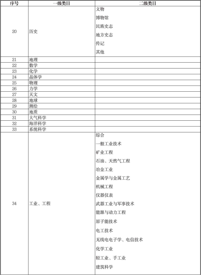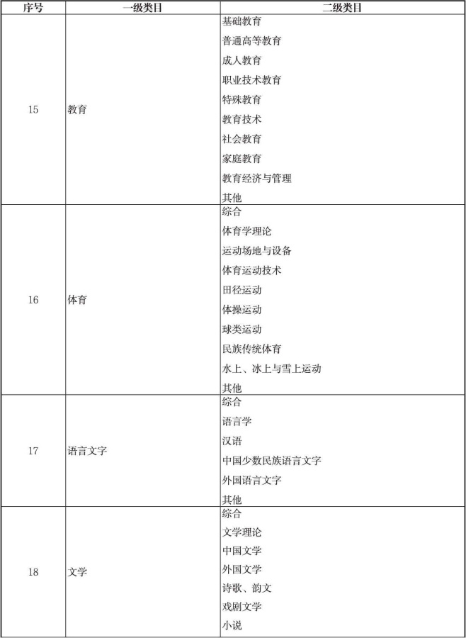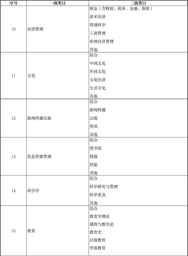参考《中国图书馆分类法》《学科分类与代码》(GB/T 13745-2009)、《学位授予和人才培养学科目录》等标准,按学科知识体系进行一、二级分类,见表2-2。为了保持与有关标准的衔接,分类类目的排列顺序参照了上述标准的次序。