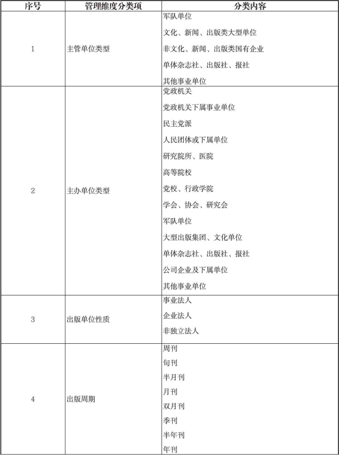 根据期刊管理含义的各个要件,除了规定项如主管单位类型、主办单位类型、出版单位性质、出版周期等可以作为分类维度外,社会各方面赋予的要素,如国家级的期刊奖,行业或学(协)会的优秀期刊,各种资金资助期刊,评价机构选出的核心期刊、来源期刊、重要转载来源期刊等也可进行特定分类,见表2-3。