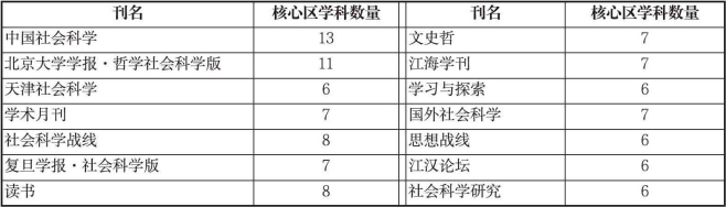 然而,出于种种因素的驱动,近些年学术期刊分版、扩版、改版、定位调整等较为频繁,核心期刊遴选体系很难及时了解、变更和准确反映这些变动。同时,刊物分类对最终结果具有决定性影响。我国大部分刊物专业性特征不强而综合性特点突出,因此只能对刊物大致分类,这就不能不影响统计结果。比如,各种体系对大学学报、社科院系统期刊的学科归类就不一致,分析结果自然不同。综合性期刊一般都含有较大的核心区学科数量(如表3-2所示),如何分类、归类,直接影响最终统计结果。就是专业类刊也非纯而又纯。比如,专业性学科特征非常明显的《经济研究》杂志,其发文仍然涉及了经济学、法学、政治学、教育学、社会学、新闻学与传播学、图书馆情报与文献学7个学科。