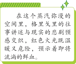 坐在那里听格里戈里讲话,让人特别愉快。炉子里摇曳着红红的火光,大锅里冒着乳白色的雾气,它们升到屋顶斜面的木板上凝成一层霜,透过天花板的缝隙,我还可以望到一线蔚蓝的天空。