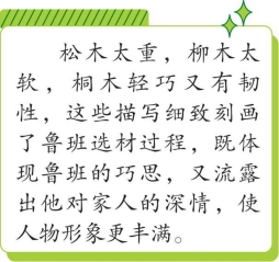 鲁班连忙冲到料场翻找木料,他的手指划过松木,直摇头说:“太重。”他的手触到柳木时,又皱眉说:“太软。”最后,他抱起一块桐木板,点了点头说:“这个轻巧又有韧性!”