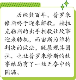 这个不幸者得到解救的一天终于来了。普罗米修斯被吊在悬崖上忍受了数百年可怕的痛苦之后,赫拉克勒斯为了寻找金苹果,正好路过这里。当他看到神的后裔普罗米修斯被吊在高加索山上,正准备向他请教良策时,赫拉克勒斯对这位被囚禁者的命运产生了怜悯之心。他看到一只雄鹰立在普罗米修斯的双膝上,正啄食着这位不幸者的肝脏。于是他把木棒和狮皮甩在身后,弯弓搭箭,一箭就把那只恶鹰从受苦者的身上射了下去。接着,他解开锁链,将被解放的普罗米修斯带走了。但为了满足宙斯的条件,他让自愿放弃永生而去受死的马人喀戎做了普罗米修斯的替身。宙斯既然已经做出判决,把普罗米修斯永远吊在悬崖上受苦,现在为了维持这个判决,必须让普罗米修斯永远戴着一个铁环,铁环的另一端拴着一小块高加索山上的石头。这样,宙斯才能自豪地说,他的敌人还一直被锁在高加索山上。
