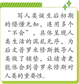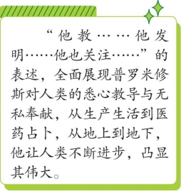 于是,普罗米修斯便来教导他们。他教他们观察星辰的升降。他发明了计算的方法,创造了拼音文字。他教他们把轭套在牲口的脖子上,使它们承担人的一部分劳动。他教他们给马匹上套,训练它们拉车。他发明了适于海上航行的船和帆。他也关注人类生活起居的其他方面。从前,人类生病便束手无策,不知道吃什么、喝什么有益于健康。他们不懂得服药来减轻自己的痛苦,于是因缺医少药而凄惨地死去。现在,普罗米修斯告诉他们如何调制药剂来医治各种各样的疾病。他又教他们预言者的本领,给他们解释先兆和梦,说明鸟雀的飞翔和牺牲的陈列。他引导他们勘察地下,让他们发现地下的铁、银和金等矿石。一句话,他把生活的一切技能和一切舒适的设备都向他们作了介绍。
