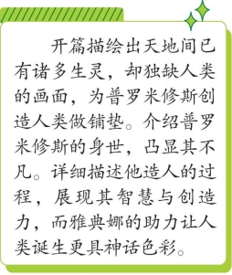 天和地被创造出来,大海起伏波动,鱼儿在海水里嬉游,群鸟在空中飞翔歌唱,地面上挤满了各种动物,但还没有那种体内有灵魂并能统治世间的生物。这时,普罗米修斯踏上了大地,他是被众神之父宙斯废黜神位的老一代神明提坦巨神的后裔,是地母盖亚与乌拉诺斯所生的伊阿珀托斯的儿子。他清楚地知道,上天的种子就蛰伏在泥土里。于是,他就掘了些泥土,用河水把泥土弄湿,然后按照世界的主宰——天神的形象揉捏成一个形体。为了让这泥做的形体获得生命,他又从各种动物的心里取来善与恶的特性,再把这善与恶封闭在泥人的胸中。在天神之中他有一个朋友,这就是智慧女神雅典娜。雅典娜很欣赏这个提坦之子的创造,便把灵魂即神灵的呼吸吹进这仅有半个生命的泥人心里。